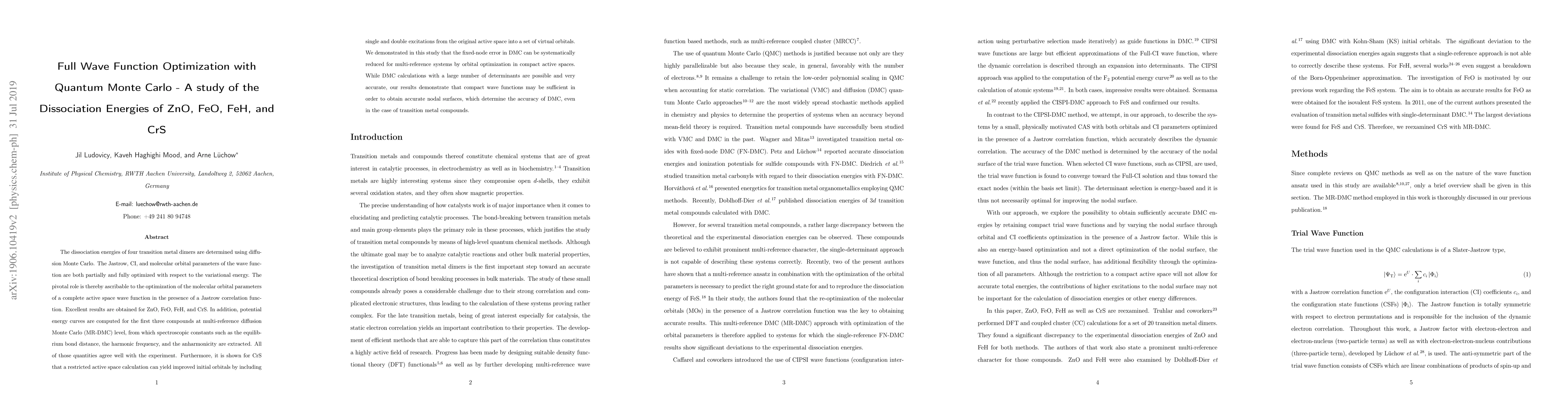 This study optimizes full wave functions using quantum Monte Carlo to determine dissociation energies for ZnO, FeO, FeH, and CrS, achieving excellent agreement with experimental results. The research highlights the effectiveness of optimizing molecular orbital parameters in a complete active space with a Jastrow correlation function, demonstrating that compact wave functions can yield accurate nodal surfaces for transition metal compounds.