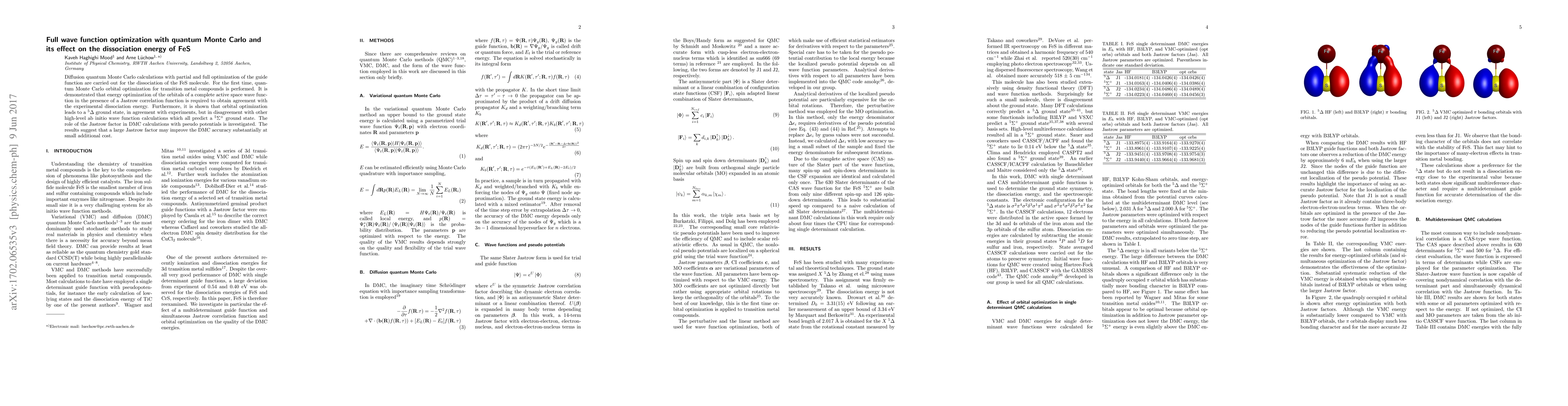 This study employs diffusion quantum Monte Carlo (DMC) to optimize the full wave function for the dissociation of FeS, revealing that orbital optimization is crucial for matching experimental dissociation energies. The optimized wave function predicts a $^5\Delta$ ground state, contradicting other high-level ab initio calculations and highlighting the importance of the Jastrow correlation function in pseudo potential-based DMC calculations.