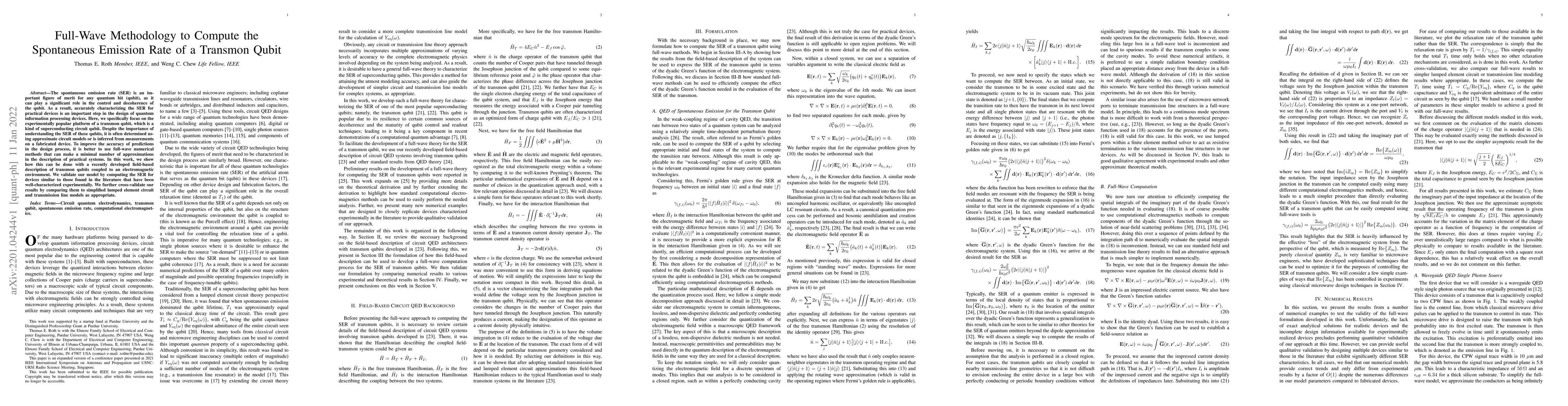 This paper presents a full-wave methodology to compute the spontaneous emission rate (SER) of transmon qubits, using a field-based description to minimize approximations. The authors validate their model by comparing computed SER values with experimental data and simplified circuit models.