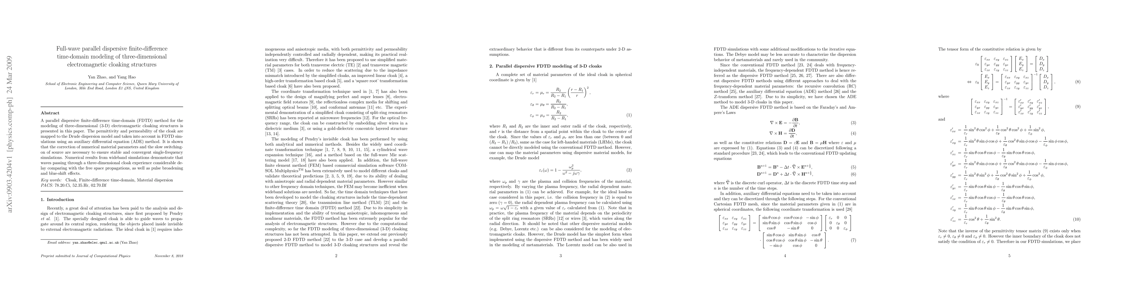A parallel dispersive finite-difference time-domain (FDTD) method for the modeling of three-dimensional (3-D) electromagnetic cloaking structures is presented in this paper. The permittivity and permeability of the cloak are mapped to the Drude dispersion model and taken into account in FDTD simulations using an auxiliary differential equation (ADE) method. It is shown that the correction of numerical material parameters and the slow switching-on of source are necessary to ensure stable and convergent single-frequency simulations. Numerical results from wideband simulations demonstrate that waves passing through a three-dimensional cloak experience considerable delay comparing with the free space propagations, as well as pulse broadening and blue-shift effects.
