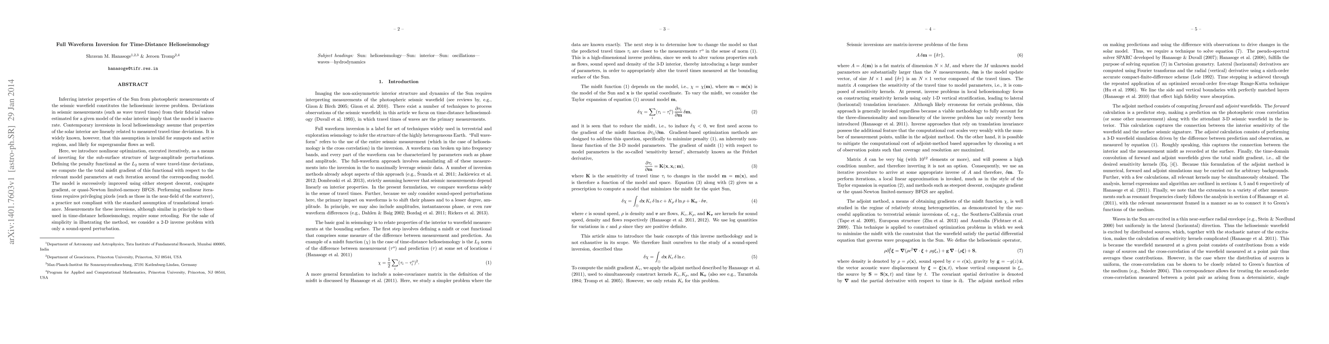 This paper introduces a nonlinear optimization method for full waveform inversion in time-distance helioseismology to infer the Sun's interior properties from seismic wave travel-time deviations. It employs iterative techniques to improve the model, moving beyond linear assumptions, and uses gradient-based optimization methods to refine the sound speed model.