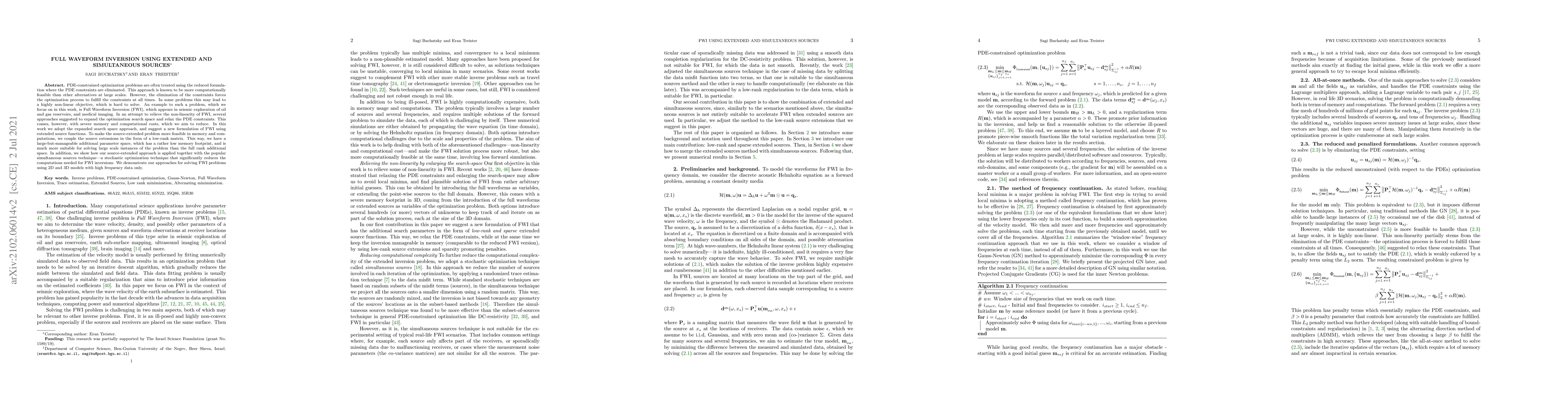PDE-constrained optimization problems are often treated using the reduced formulation where the PDE constraints are eliminated. This approach is known to be more computationally feasible than other alternatives at large scales. However, the elimination of the constraints forces the optimization process to fulfill the constraints at all times. In some problems this may lead to a highly non-linear objective, which is hard to solve. An example to such a problem, which we focus on in this work, is Full Waveform Inversion (FWI), which appears in seismic exploration of oil and gas reservoirs, and medical imaging. In an attempt to relieve the non-linearity of FWI, several approaches suggested to expand the optimization search space and relax the PDE constraints. This comes, however, with severe memory and computational costs, which we aim to reduce. In this work we adopt the expanded search space approach, and suggest a new formulation of FWI using extended source functions. To make the source-extended problem more feasible in memory and computations, we couple the source extensions in the form of a low-rank matrix. This way, we have a large-but-manageable additional parameter space, which has a rather low memory footprint, and is much more suitable for solving large scale instances of the problem than the full rank additional space. In addition, we show how our source-extended approach is applied together with the popular simultaneous sources technique -- a stochastic optimization technique that significantly reduces the computations needed for FWI inversions. We demonstrate our approaches for solving FWI problems using 2D and 3D models with high frequency data only.