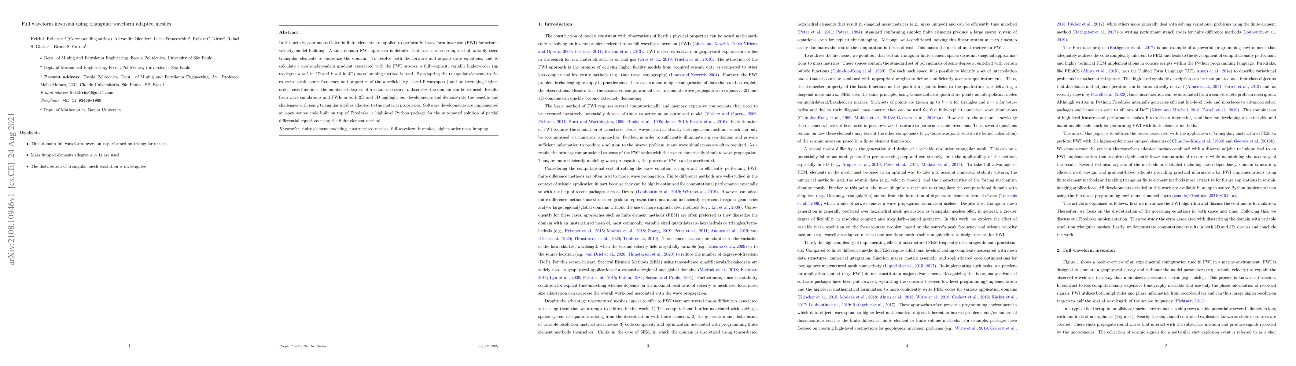 In this article, continuous Galerkin finite elements are applied to perform full waveform inversion (FWI) for seismic velocity model building. A time-domain FWI approach is detailed that uses meshes composed of variably sized triangular elements to discretize the domain. To resolve both the forward and adjoint-state equations, and to calculate a mesh-independent gradient associated with the FWI process, a fully-explicit, variable higher-order (up to degree $k=5$ in $2$D and $k=3$ in 3D) mass lumping method is used. By adapting the triangular elements to the expected peak source frequency and properties of the wavefield (e.g., local P-wavespeed) and by leveraging higher-order basis functions, the number of degrees-of-freedom necessary to discretize the domain can be reduced. Results from wave simulations and FWIs in both $2$D and 3D highlight our developments and demonstrate the benefits and challenges with using triangular meshes adapted to the material proprieties. Software developments are implemented an open source code built on top of Firedrake, a high-level Python package for the automated solution of partial differential equations using the finite element method.