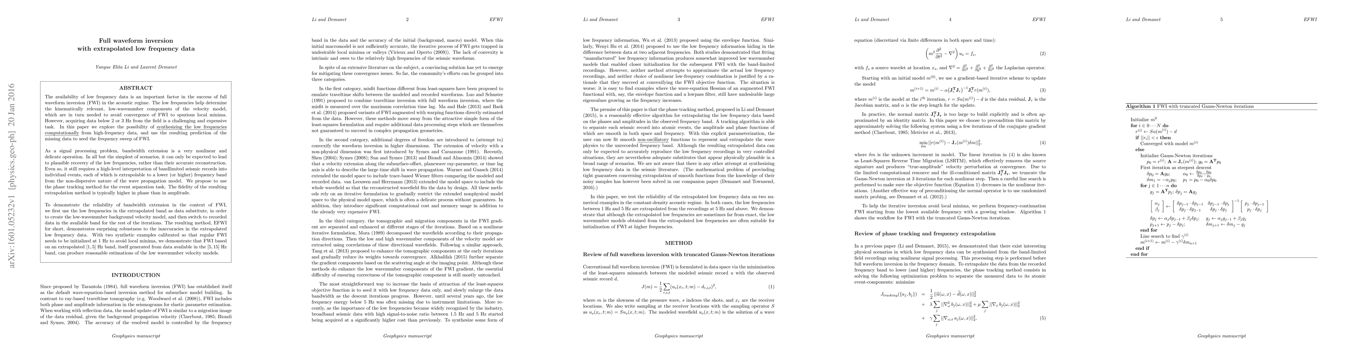 This paper proposes a method to synthesize low-frequency data from high-frequency seismic data to enhance full waveform inversion (FWI) in the acoustic regime. The method uses phase tracking to separate and extrapolate low-frequency components, demonstrating robustness and producing reasonable low wavenumber velocity models even with inaccuracies in the extrapolated data.