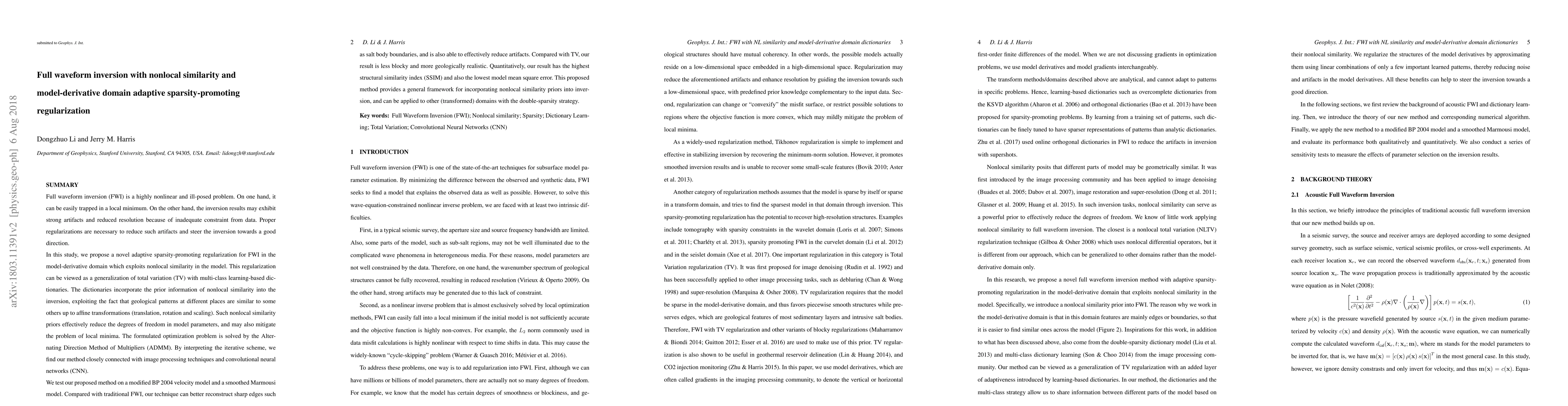 This paper proposes an adaptive sparsity-promoting regularization for full waveform inversion (FWI) that leverages nonlocal similarity and model-derivative domain adaptation. The method effectively reduces artifacts and local minima issues, achieving better reconstruction of sharp geological features compared to traditional FWI and total variation approaches.