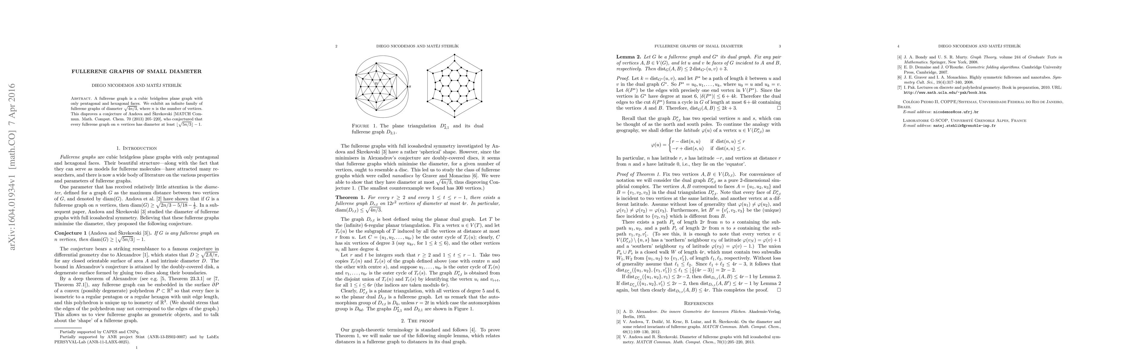 A fullerene graph is a cubic bridgeless plane graph with only pentagonal and hexagonal faces. We exhibit an infinite family of fullerene graphs of diameter $\sqrt{4n/3}$, where $n$ is the number of vertices. This disproves a conjecture of Andova and \v{S}krekovski [MATCH Commun. Math. Comput. Chem. 70 (2013) 205-220], who conjectured that every fullerene graph on $n$ vertices has diameter at least $\lfloor \sqrt{5n/3}\rfloor-1$.