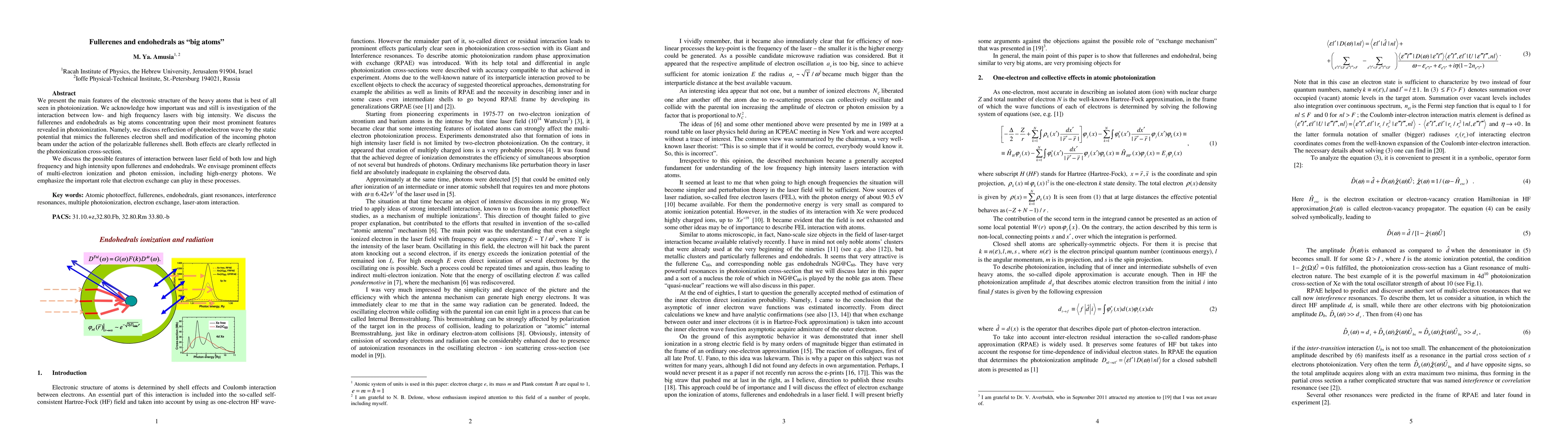 We present the main features of the electronic structure of the heavy atoms that is best of all seen in photoionization. We acknowledge how important was and still is investigation of the interaction between low- and high frequency lasers with big intensity. We discuss the fullerenes and endohedrals as big atoms concentrating upon their most prominent features revealed in photoionization. Namely, we discuss reflection of photoelectron wave by the static potential that mimics the fullerenes electron shell and modification of the incoming photon beam under the action of the polarizable fullerenes shell. Both effects are clearly reflected in the photoionization cross-section. We discuss the possible features of interaction between laser field of both low and high frequency and high intensity upon fullerenes and endohedrals. We envisage prominent effects of multi-electron ionization and photon emission, including high energy photons. We emphasize the important role that can be played by electron exchange in these processes.
