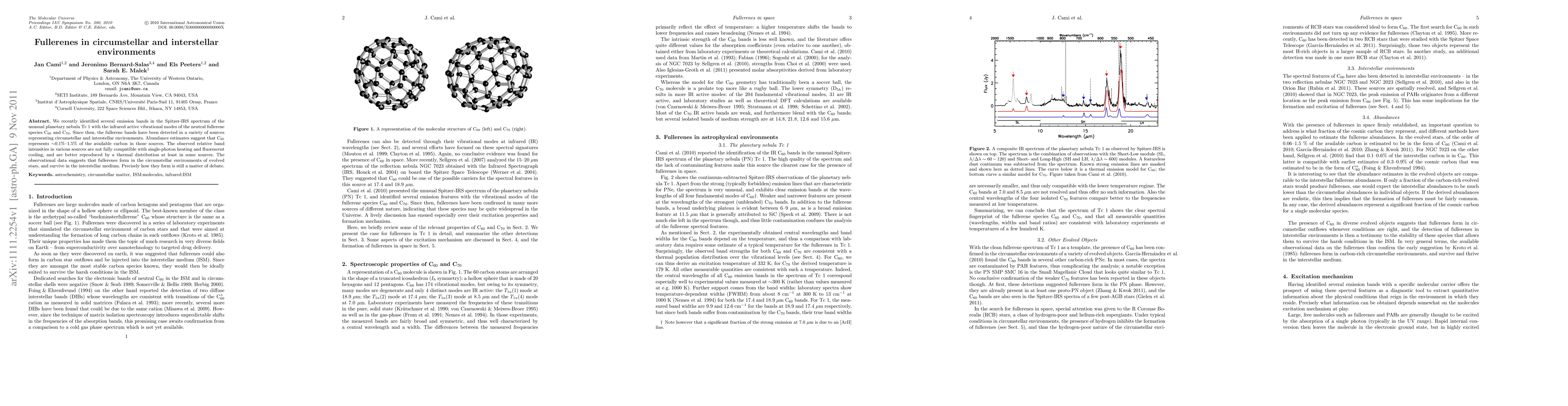 This research identifies fullerene species C60 and C70 in various circumstellar and interstellar environments, suggesting they form in evolved stars and survive in space. Fullerene abundances range from 0.1%-1.5% of available carbon, with formation mechanisms still under debate.