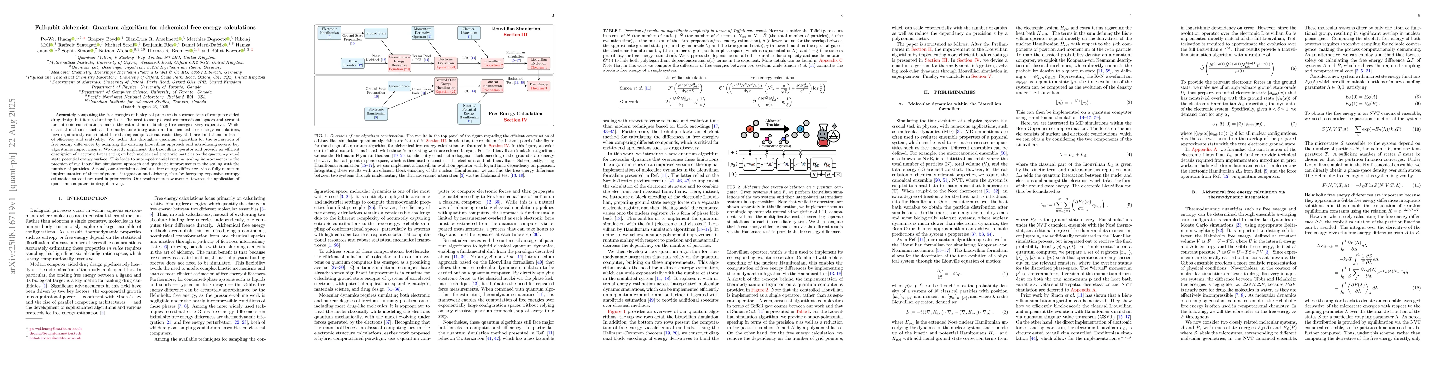Accurately computing the free energies of biological processes is a cornerstone of computer-aided drug design but it is a daunting task. The need to sample vast conformational spaces and account for entropic contributions makes the estimation of binding free energies very expensive. While classical methods, such as thermodynamic integration and alchemical free energy calculations, have significantly contributed to reducing computational costs, they still face limitations in terms of efficiency and scalability. We tackle this through a quantum algorithm for the estimation of free energy differences by adapting the existing Liouvillian approach and introducing several key algorithmic improvements. We directly implement the Liouvillian operator and provide an efficient description of electronic forces acting on both nuclear and electronic particles on the quantum ground state potential energy surface. This leads to super-polynomial runtime scaling improvements in the precision of our Liouvillian simulation approach and quadratic improvements in the scaling with the number of particles. Second, our algorithm calculates free energy differences via a fully quantum implementation of thermodynamic integration and alchemy, thereby foregoing expensive entropy estimation subroutines used in prior works. Our results open new avenues towards the application of quantum computers in drug discovery.
