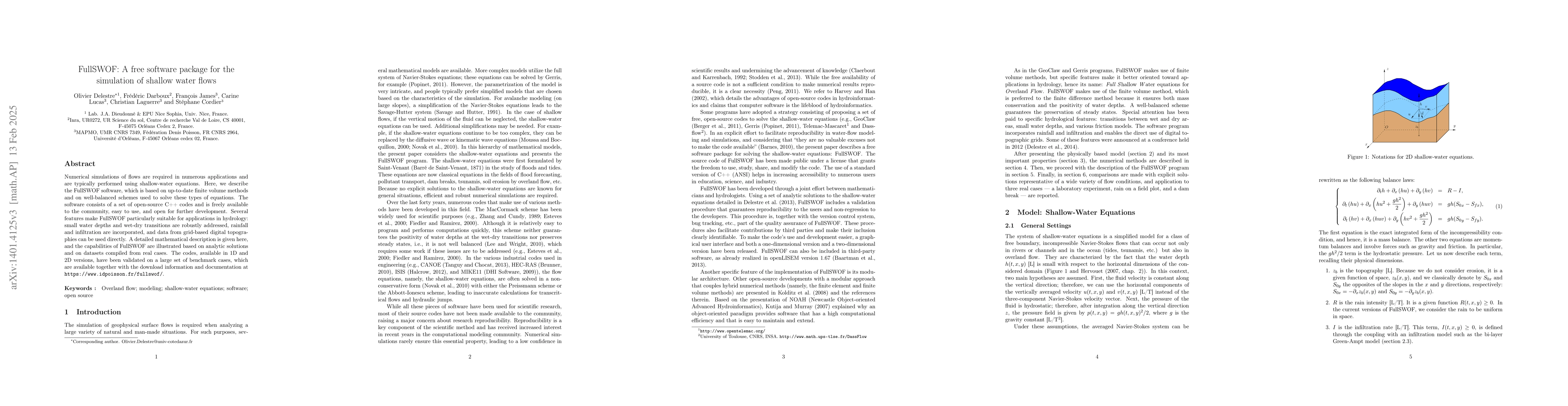 FullSWOF is an open-source C++ software package for simulating shallow water flows using advanced finite volume methods. It robustly handles wet-dry transitions and integrates rainfall and infiltration, making it suitable for hydrology applications.