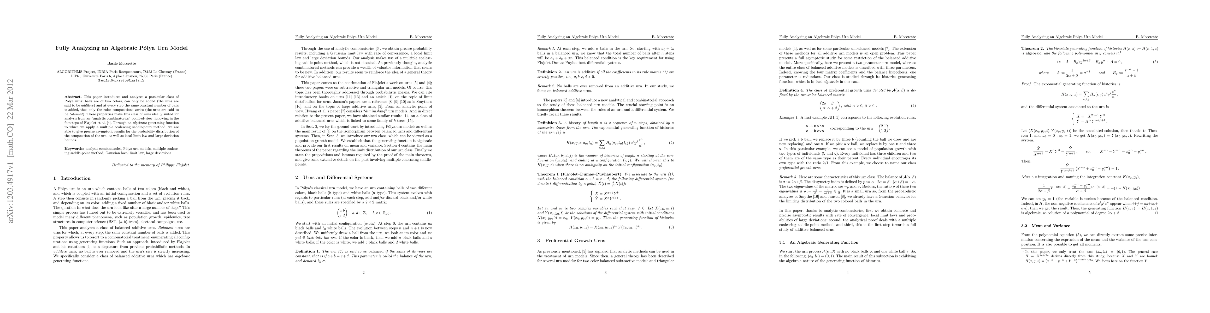 This paper introduces and analyzes a particular class of Polya urns: balls are of two colors, can only be added (the urns are said to be additive) and at every step the same constant number of balls is added, thus only the color compositions varies (the urns are said to be balanced). These properties make this class of urns ideally suited for analysis from an "analytic combinatorics" point-of-view, following in the footsteps of Flajolet-Dumas-Puyhaubert, 2006. Through an algebraic generating function to which we apply a multiple coalescing saddle-point method, we are able to give precise asymptotic results for the probability distribution of the composition of the urn, as well as local limit law and large deviation bounds.