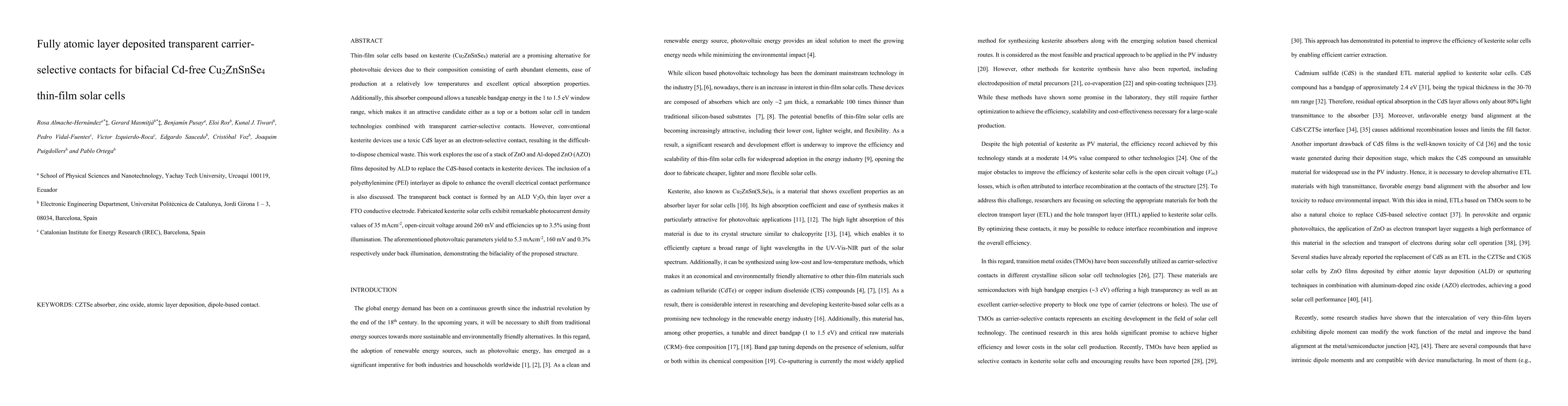 Thin-film solar cells based on kesterite (Cu2ZnSnSe4) material are a promising alternative for photovoltaic devices due to their composition consisting of earth abundant elements, ease of production at a relatively low temperatures and excellent optical absorption properties. Additionally, this absorber compound allows a tuneable bandgap energy in the 1 to 1.5 eV window range, which makes it an attractive candidate either as a top or a bottom solar cell in tandem technologies combined with transparent carrier-selective contacts. However, conventional kesterite devices use a toxic CdS layer as an electron-selective contact, resulting in the difficultto-dispose chemical waste. This work explores the use of a stack of ZnO and Al-doped ZnO (AZO) films deposited by ALD to replace the CdS-based contacts in kesterite devices. The inclusion of a polyethylenimine (PEI) interlayer as dipole to enhance the overall electrical contact performance is also discussed. The transparent back contact is formed by an ALD V2Ox thin layer over a FTO conductive electrode. Fabricated kesterite solar cells exhibit remarkable photocurrent density values of 35 mAcm-2, open-circuit voltage around 260 mV and efficiencies up to 3.5% using front illumination. The aforementioned photovoltaic parameters yield to 5.3 mAcm-2, 160 mV and 0.3% respectively under back illumination, demonstrating the bifaciality of the proposed structure.