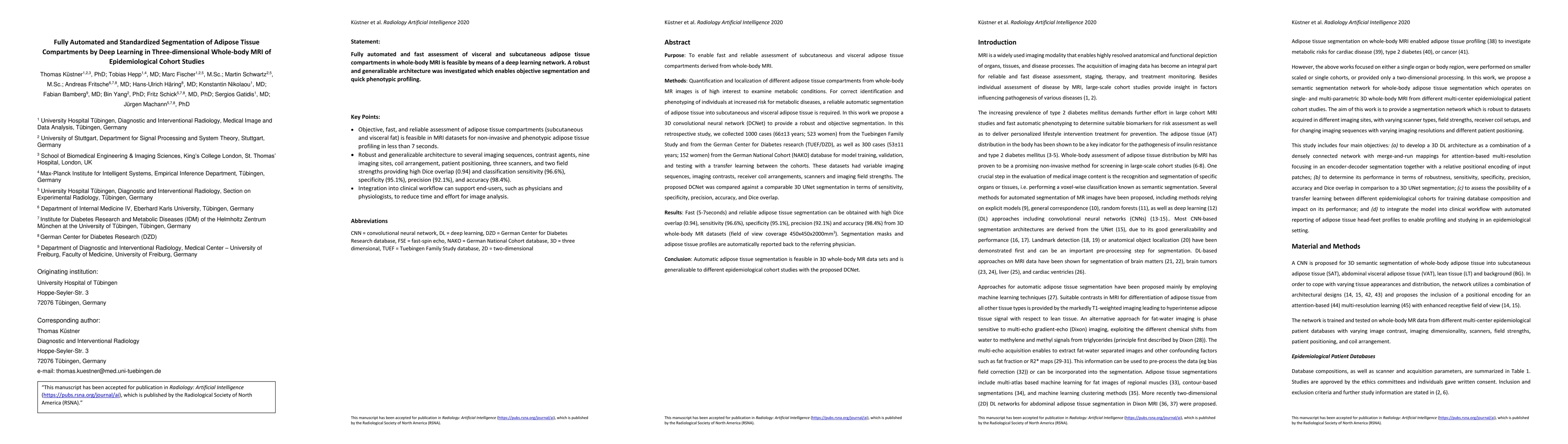 This paper proposes a 3D convolutional neural network (DCNet) for automated segmentation of subcutaneous and visceral adipose tissue from whole-body MRI scans, achieving high accuracy and reliability. The DCNet was trained and validated using diverse datasets from multiple epidemiological cohorts, demonstrating its applicability across different imaging conditions.