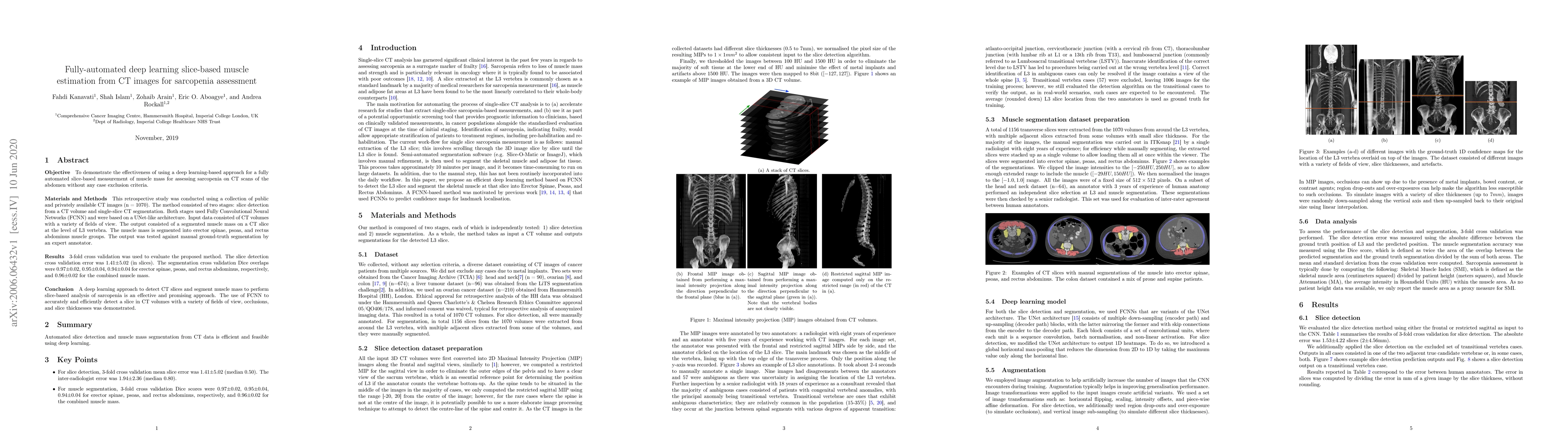 This study presents a fully automated deep learning method using Fully Convolutional Neural Networks for slice-based muscle mass estimation in CT scans to assess sarcopenia, achieving high segmentation accuracy with Dice overlaps above 0.94 for individual muscle groups.