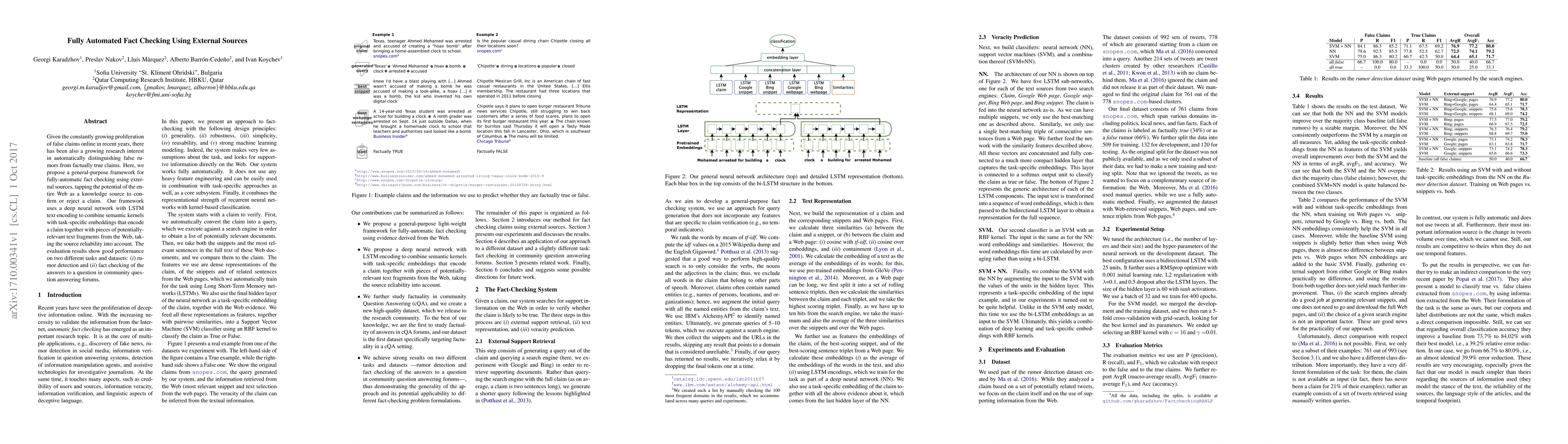 Researchers propose a framework for fully-automated fact checking using external sources, achieving good performance on rumor detection and community question answering forums.