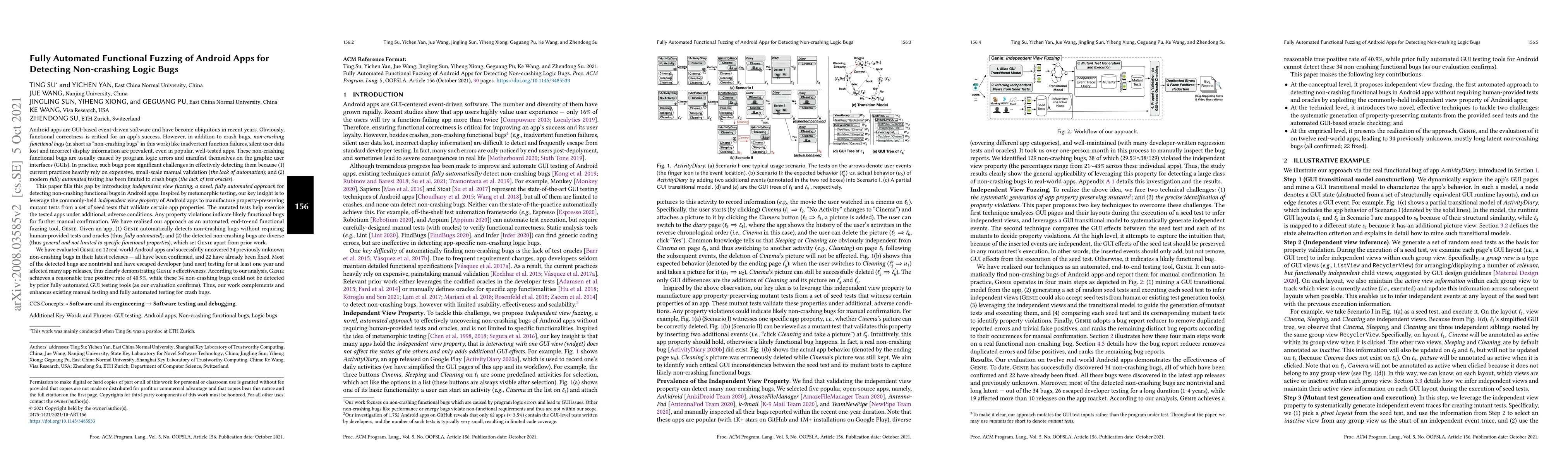 Genie, an automated, end-to-end functional fuzzing tool for Android apps, utilizing independent view fuzzing to detect non-crashing functional bugs by generating property-preserving mutant tests from seed tests.