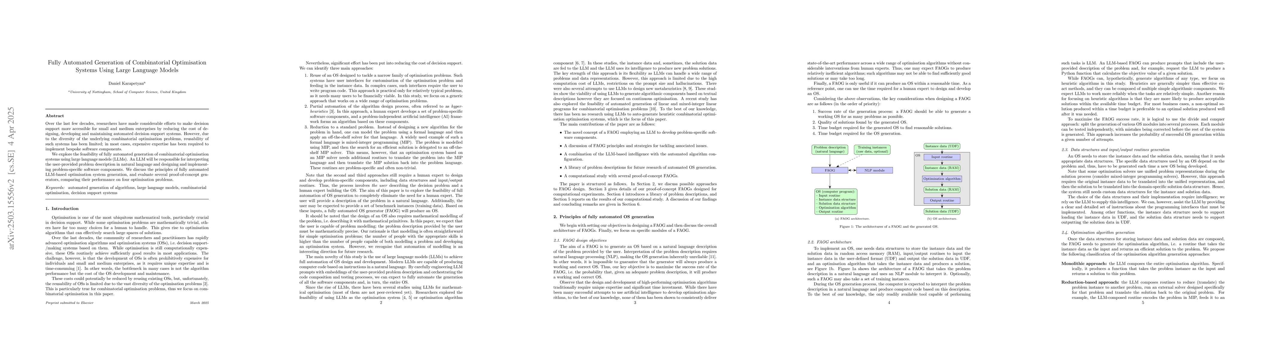 Over the last few decades, there has been a considerable effort to make decision support more accessible for small and medium enterprises by reducing the cost of design, development and maintenance of automated decision support systems. However, due to the diversity of the underlying combinatorial optimisation problems, reusability of such systems has been limited; in most cases, expensive expertise has been necessary to implement bespoke software components. We investigate the possibility of fully automated generation of combinatorial optimisation systems by utilising the large language models (LLMs). An LLM will be responsible for interpreting the problem description provided by the user in a natural language and designing and implementing problem-specific software components. We discuss the principles of fully automated LLM-based generation of optimisation systems, and evaluate several proof-of-concept generators, comparing their performance on four optimisation problems.