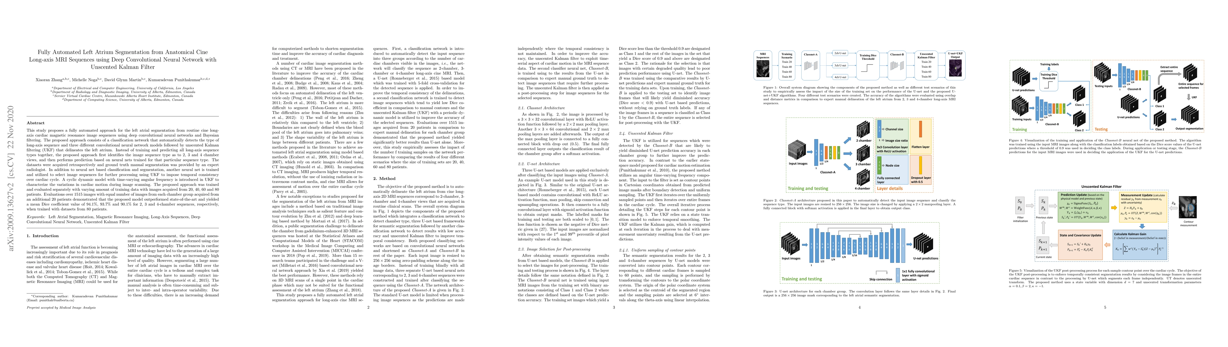 This study presents a fully automated method for left atrium segmentation using deep convolutional neural networks and an unscented Kalman filter for cine long-axis MRI sequences. The approach segments the left atrium based on identified 2, 3, and 4 chamber views, achieving a mean Dice coefficient of 94.1%, 93.7%, and 90.1% respectively, outperforming existing methods.