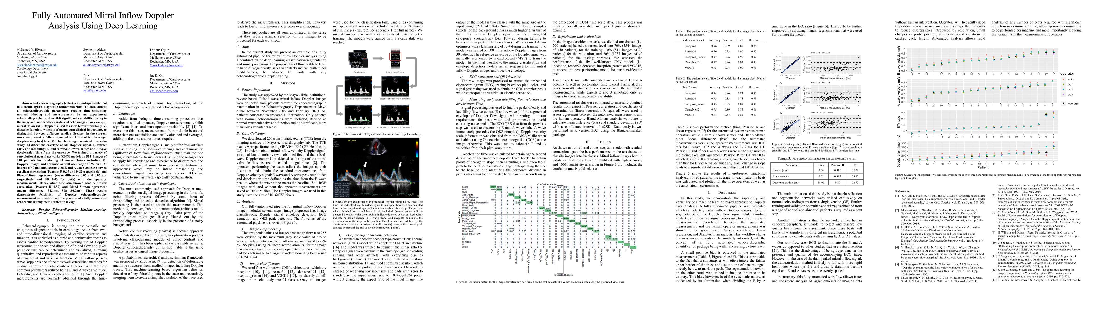 Echocardiography (echo) is an indispensable tool in a cardiologist's diagnostic armamentarium. To date, almost all echocardiographic parameters require time-consuming manual labeling and measurements by an experienced echocardiographer and exhibit significant variability, owing to the noisy and artifact-laden nature of echo images. For example, mitral inflow (MI) Doppler is used to assess left ventricular (LV) diastolic function, which is of paramount clinical importance to distinguish between different cardiac diseases. In the current work we present a fully automated workflow which leverages deep learning to a) label MI Doppler images acquired in an echo study, b) detect the envelope of MI Doppler signal, c) extract early and late filing (E and A wave) flow velocities and E-wave deceleration time from the envelope. We trained a variety of convolutional neural networks (CNN) models on 5544 images of 140 patients for predicting 24 image classes including MI Doppler images and obtained overall accuracy of 0.97 on 1737 images of 40 patients. Automated E and A wave velocity showed excellent correlation (Pearson R 0.99 and 0.98 respectively) and Bland Altman agreement (mean difference 0.06 and 0.05 m/s respectively and SD 0.03 for both) with the operator measurements. Deceleration time also showed good but lower correlation (Pearson R 0.82) and Bland-Altman agreement (mean difference: 34.1ms, SD: 30.9ms). These results demonstrate feasibility of Doppler echocardiography measurement automation and the promise of a fully automated echocardiography measurement package.