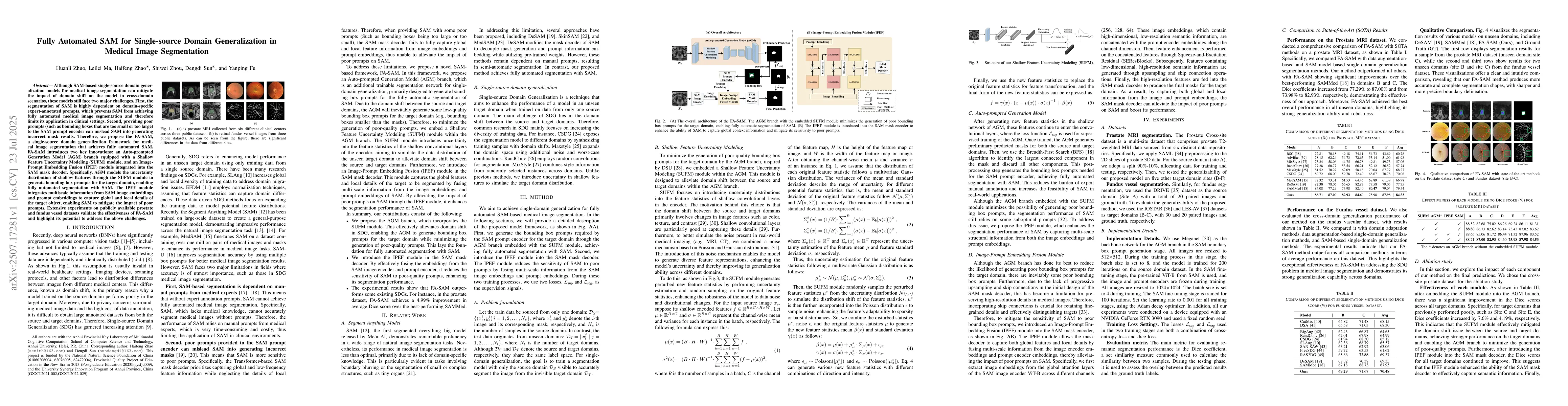 Although SAM-based single-source domain generalization models for medical image segmentation can mitigate the impact of domain shift on the model in cross-domain scenarios, these models still face two major challenges. First, the segmentation of SAM is highly dependent on domain-specific expert-annotated prompts, which prevents SAM from achieving fully automated medical image segmentation and therefore limits its application in clinical settings. Second, providing poor prompts (such as bounding boxes that are too small or too large) to the SAM prompt encoder can mislead SAM into generating incorrect mask results. Therefore, we propose the FA-SAM, a single-source domain generalization framework for medical image segmentation that achieves fully automated SAM. FA-SAM introduces two key innovations: an Auto-prompted Generation Model (AGM) branch equipped with a Shallow Feature Uncertainty Modeling (SUFM) module, and an Image-Prompt Embedding Fusion (IPEF) module integrated into the SAM mask decoder. Specifically, AGM models the uncertainty distribution of shallow features through the SUFM module to generate bounding box prompts for the target domain, enabling fully automated segmentation with SAM. The IPEF module integrates multiscale information from SAM image embeddings and prompt embeddings to capture global and local details of the target object, enabling SAM to mitigate the impact of poor prompts. Extensive experiments on publicly available prostate and fundus vessel datasets validate the effectiveness of FA-SAM and highlight its potential to address the above challenges.