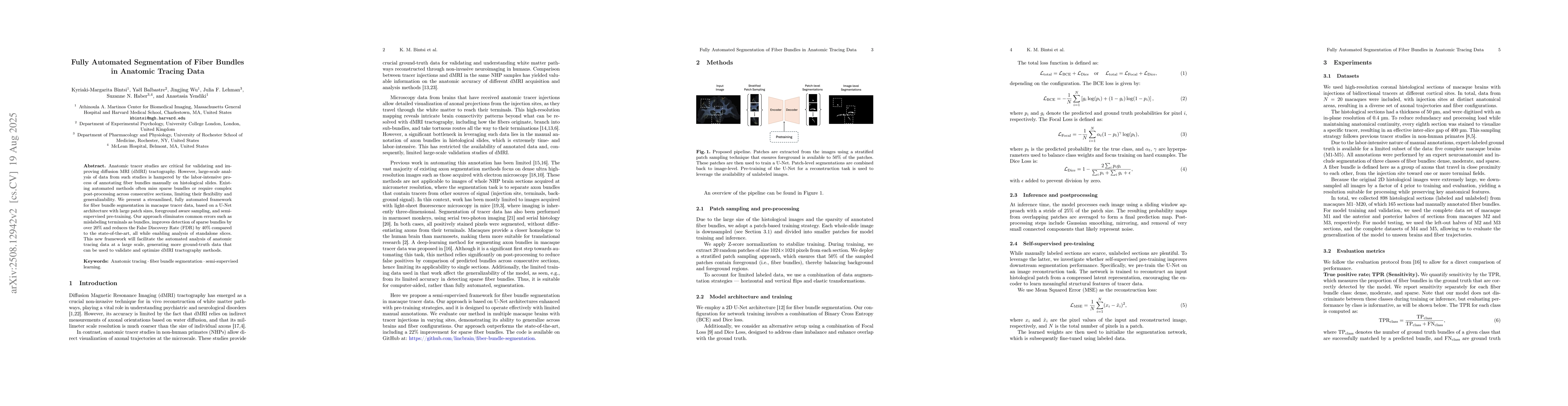 Anatomic tracer studies are critical for validating and improving diffusion MRI (dMRI) tractography. However, large-scale analysis of data from such studies is hampered by the labor-intensive process of annotating fiber bundles manually on histological slides. Existing automated methods often miss sparse bundles or require complex post-processing across consecutive sections, limiting their flexibility and generalizability. We present a streamlined, fully automated framework for fiber bundle segmentation in macaque tracer data, based on a U-Net architecture with large patch sizes, foreground aware sampling, and semisupervised pre-training. Our approach eliminates common errors such as mislabeling terminals as bundles, improves detection of sparse bundles by over 20% and reduces the False Discovery Rate (FDR) by 40% compared to the state-of-the-art, all while enabling analysis of standalone slices. This new framework will facilitate the automated analysis of anatomic tracing data at a large scale, generating more ground-truth data that can be used to validate and optimize dMRI tractography methods.