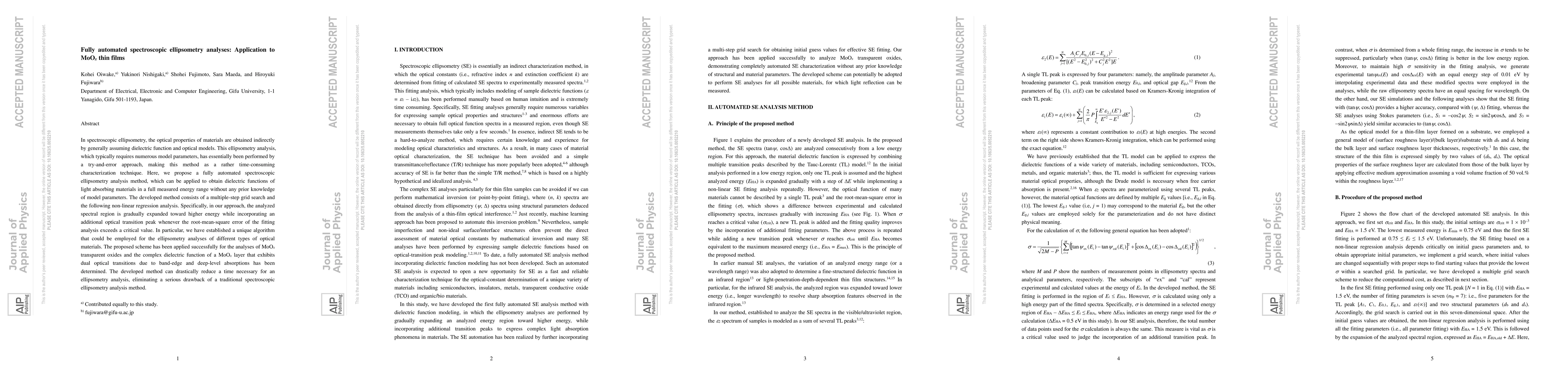 This paper proposes a fully automated method for spectroscopic ellipsometry analysis, significantly reducing the time required for determining the optical properties of materials like MoOx thin films. The method employs a multiple-step grid search and non-linear regression, expanding the spectral region and incorporating additional optical transition peaks as needed, thereby eliminating the need for prior knowledge of model parameters.