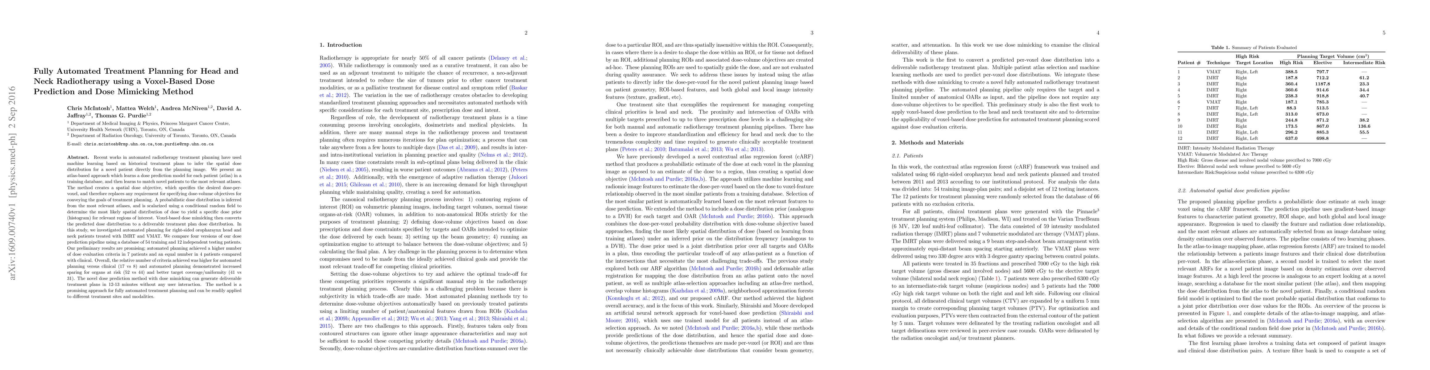 This paper presents a fully automated treatment planning method for head and neck radiotherapy using a voxel-based dose prediction and dose mimicking approach. The method shows promising results, achieving more dose evaluation criteria and better sparing of organs at risk compared to clinical plans.