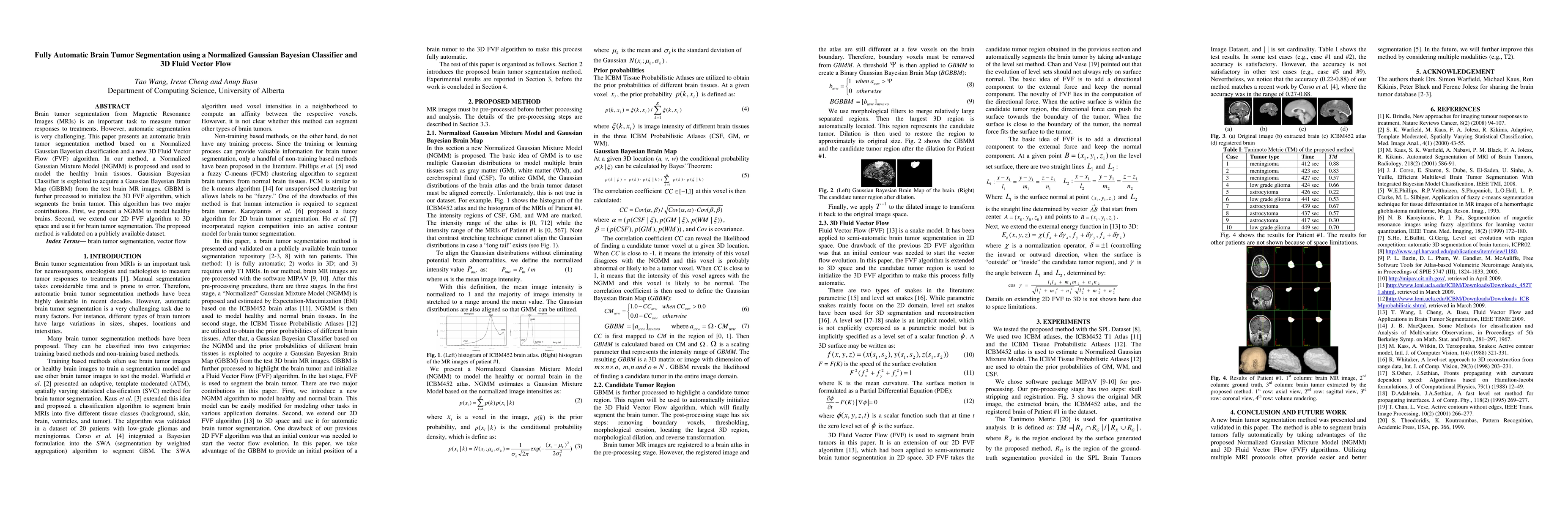 A new brain tumor segmentation method was presented and validated in this paper using a Normalized Gaussian Mixture Model (NGMM) and 3D Fluid Vector Flow (FVF) algorithms.