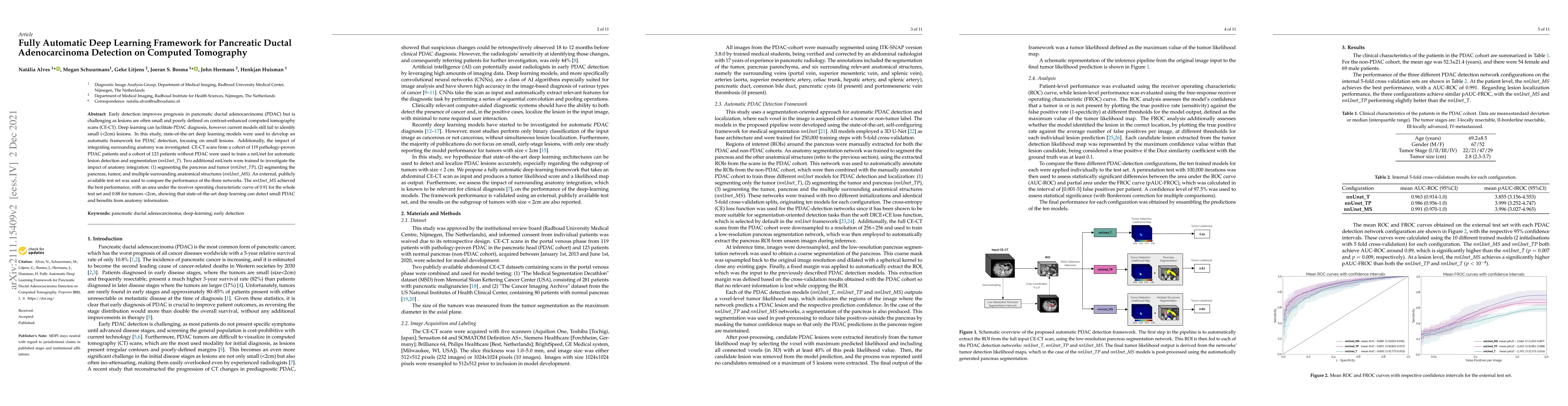 This study developed a fully automatic deep learning framework using nnUnet models to detect pancreatic ductal adenocarcinoma (PDAC) on computed tomography scans, focusing on small lesions. The best-performing model, nnUnet_MS, which integrated surrounding anatomy, achieved superior detection performance, indicating that integrating anatomical context enhances the identification of small PDAC lesions.
