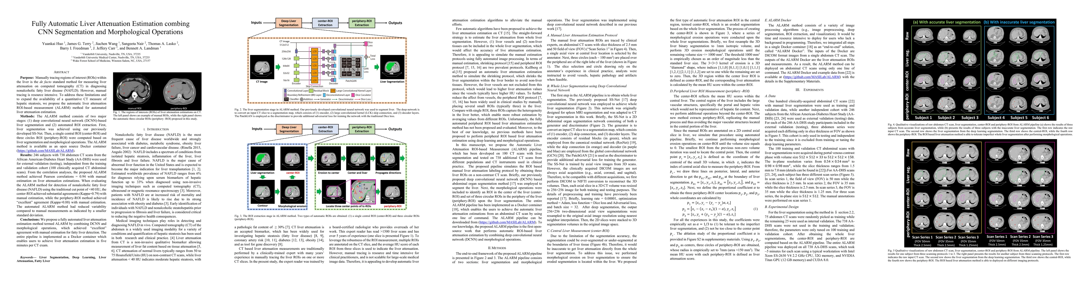 The paper proposes the ALARM method for fully automatic liver attenuation estimation using CNN segmentation and morphological operations, aiming to replace manual ROI tracing in CT scans for diagnosing nonalcoholic fatty liver disease. The method includes liver segmentation via SS-Net and automated ROI extraction, validated on 246 subjects with 738 CT scans.