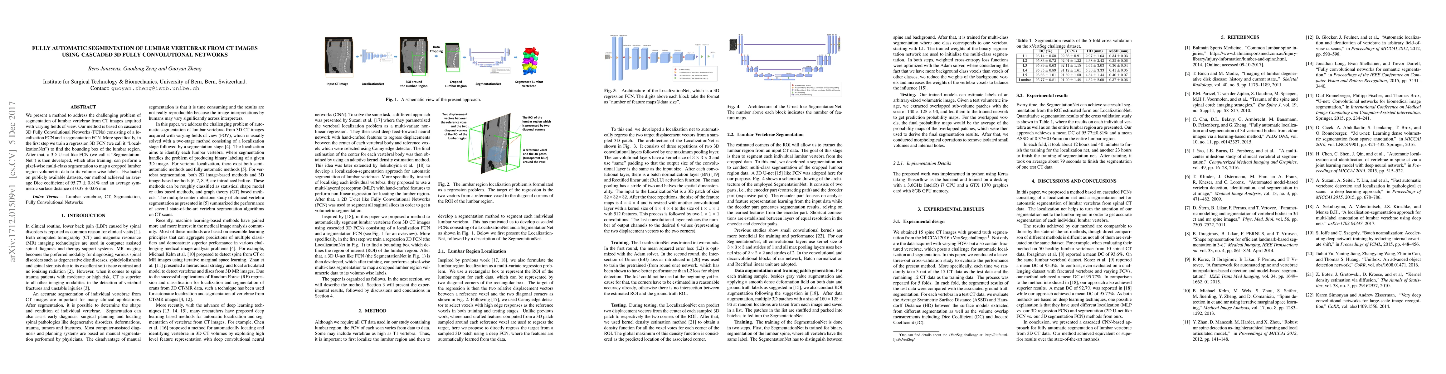 This paper introduces a method for segmenting lumbar vertebrae from CT images using cascaded 3D Fully Convolutional Networks (FCNs). The approach employs a "LocalizationNet" to identify the lumbar region and a "SegmentationNet" for precise pixel-wise segmentation, achieving an average Dice coefficient of 95.77% and a symmetric surface distance of 0.37 mm.