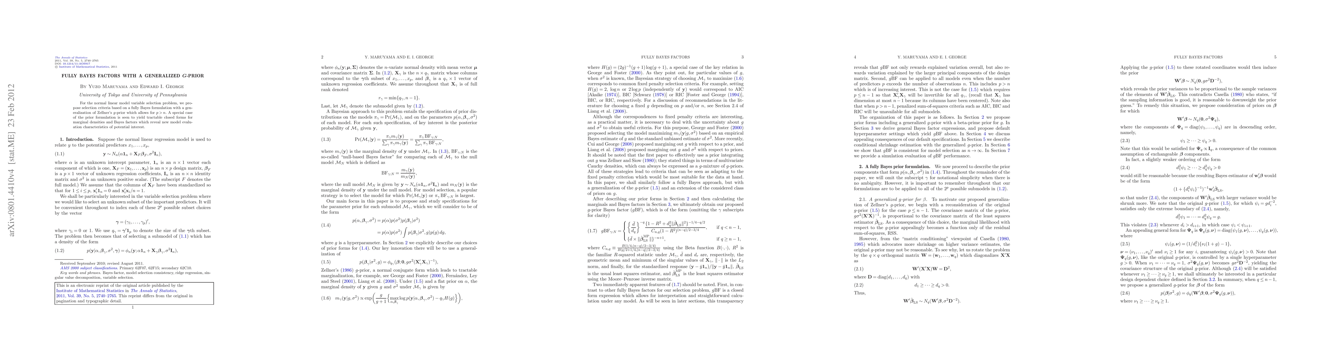 For the normal linear model variable selection problem, we propose selection criteria based on a fully Bayes formulation with a generalization of Zellner's $g$-prior which allows for $p>n$. A special case of the prior formulation is seen to yield tractable closed forms for marginal densities and Bayes factors which reveal new model evaluation characteristics of potential interest.