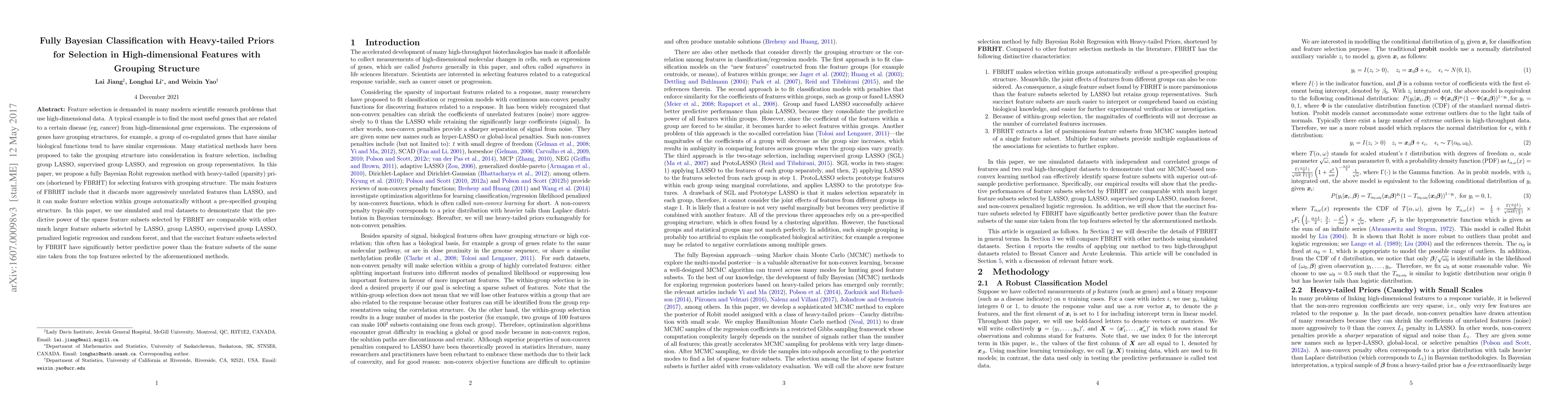 This paper proposes a fully Bayesian Robit regression method with heavy-tailed priors (FBRHT) for high-dimensional feature selection, especially in data with inherent grouping structures. FBRHT aggressively discards unrelated features and automatically selects features within groups without predefined structures, demonstrating superior predictive power compared to other methods.