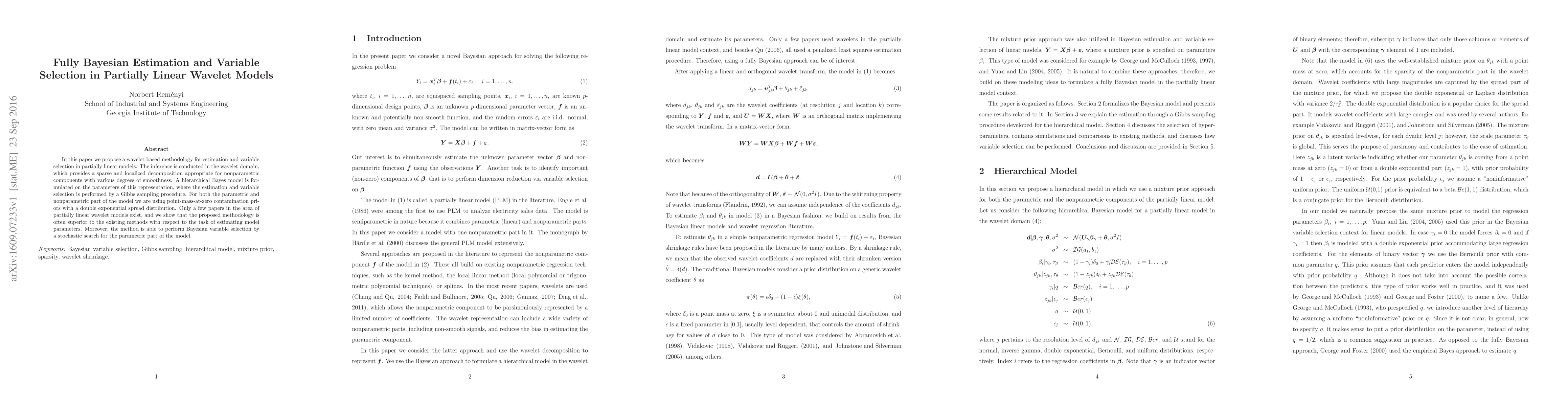 This paper proposes a wavelet-based methodology for estimating and selecting variables in partially linear models using a hierarchical Bayes approach and Gibbs sampling. The wavelet domain provides a sparse and localized decomposition, and the method outperforms existing techniques in parameter estimation and performs Bayesian variable selection.