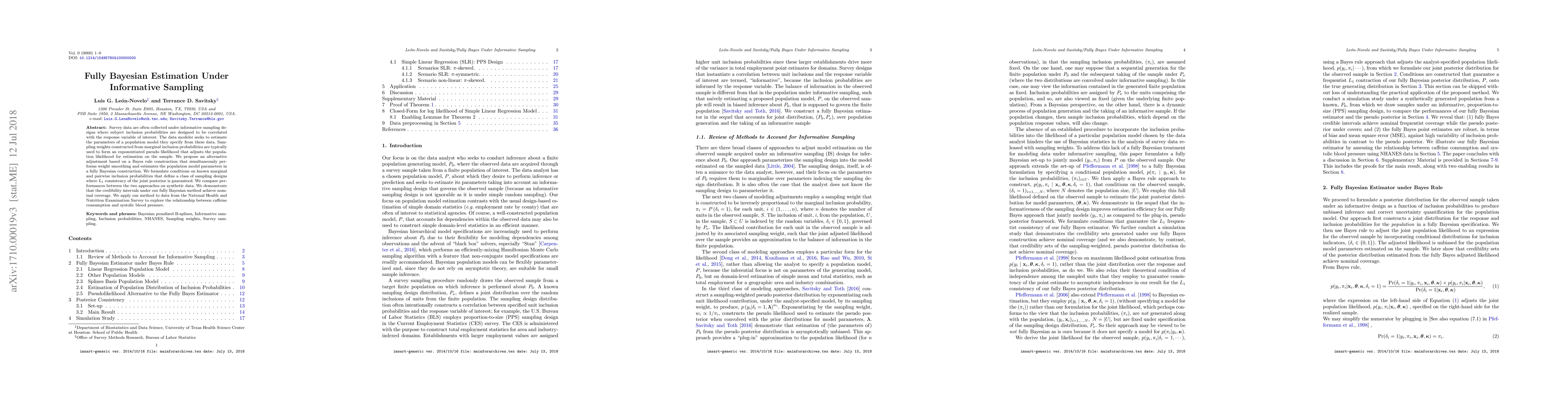 This paper proposes a fully Bayesian estimation method for models under informative sampling, contrasting it with traditional weight-based approaches. The new method ensures $L_{1}$ consistency of the joint posterior and better estimates posterior uncertainty without needing to calibrate sampling weights, as demonstrated through synthetic data and an application to the National Health and Nutrition Examination Survey.