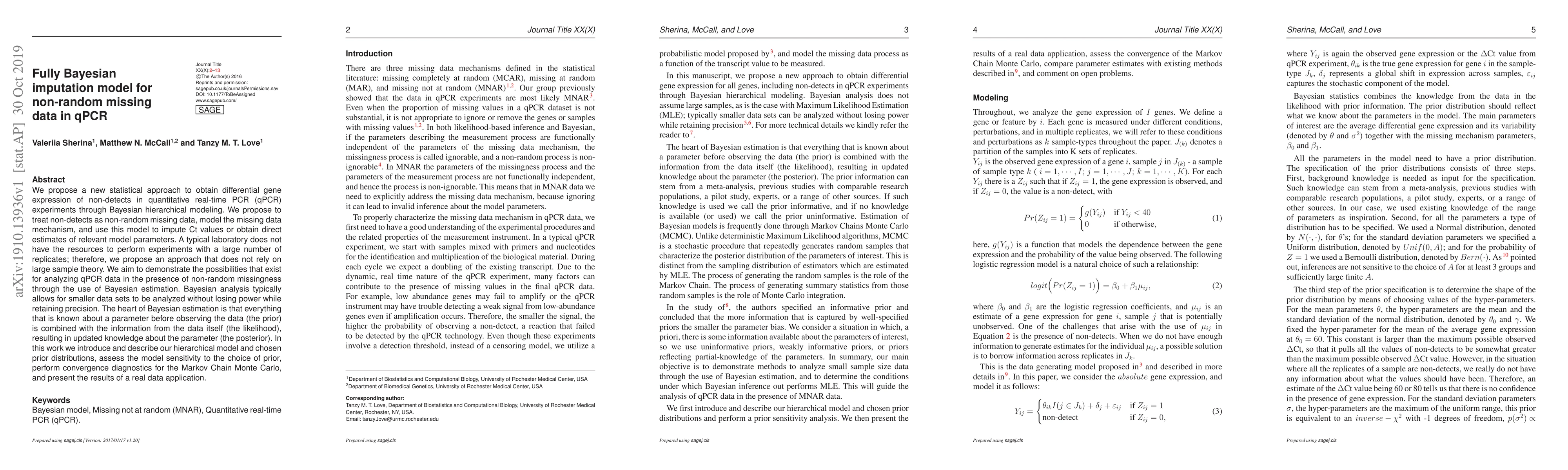 This paper introduces a Bayesian hierarchical modeling approach for imputing non-detects in qPCR experiments, treating non-detects as non-random missing data. The method aims to analyze qPCR data with limited replicates, leveraging Bayesian estimation to combine prior knowledge with data likelihood, resulting in updated parameter estimates.