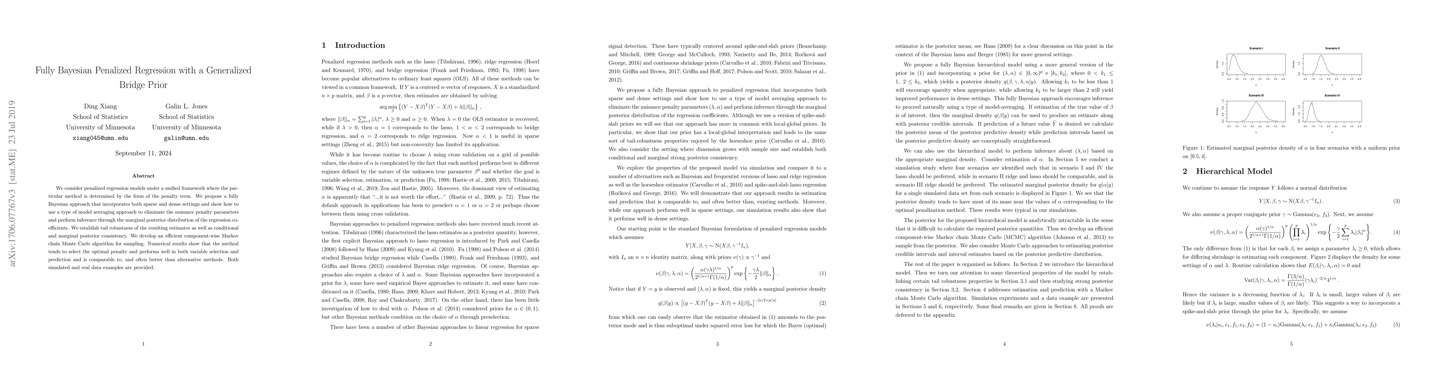 We consider penalized regression models under a unified framework where the particular method is determined by the form of the penalty term. We propose a fully Bayesian approach that incorporates both sparse and dense settings and show how to use a type of model averaging approach to eliminate the nuisance penalty parameters and perform inference through the marginal posterior distribution of the regression coefficients. We establish tail robustness of the resulting estimator as well as conditional and marginal posterior consistency. We develop an efficient component-wise Markov chain Monte Carlo algorithm for sampling. Numerical results show that the method tends to select the optimal penalty and performs well in both variable selection and prediction and is comparable to, and often better than alternative methods. Both simulated and real data examples are provided.