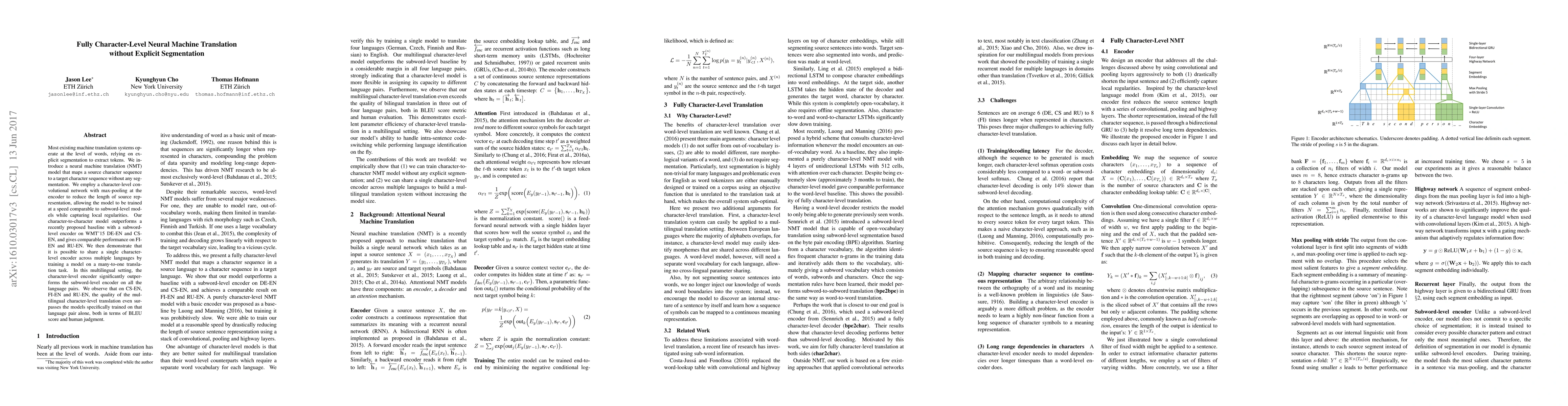 This paper proposes a character-level neural machine translation model that eliminates the need for explicit segmentation, achieving competitive translation performance compared to subword-level models. The character-level encoder, trained on multiple languages, outperforms subword-level models in multilingual settings and sometimes even surpasses language-specific models.