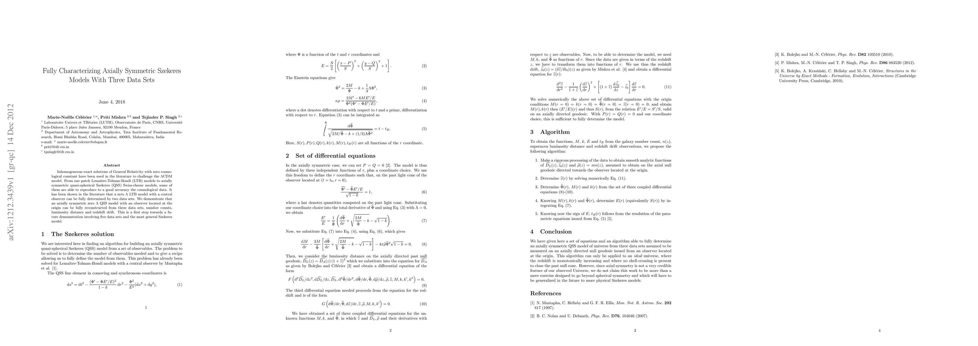 This paper demonstrates that an axially symmetric Szekeres model in General Relativity can be fully reconstructed using three data sets: number counts, luminosity distance, and redshift drift. This advancement paves the way for future work aiming to reconstruct the most general Szekeres model with five data sets.