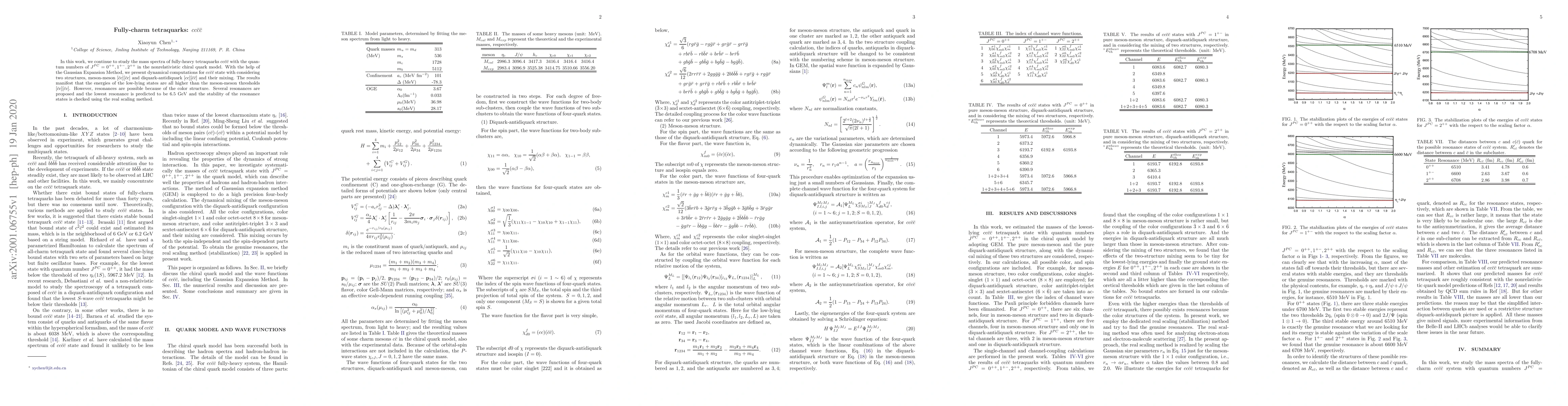 In this work, we continue to study the mass spectra of fully-heavy tetraquarks $cc\bar{c}\bar{c}$ with the quantum numbers of $J^{PC}=0^{++}, 1^{+-}, 2^{++}$ in the nonrelativistic chiral quark model. With the help of the Gaussian Expansion Method, we present dynamical computations for $cc\bar{c}\bar{c}$ state with considering two structures, meson-meson [$\bar{c}c$][$\bar{c}c$] and diquark-antidiquark [$cc$][$\bar{c}\bar{c}$] and their mixing. The results manifest that the energies of the low-lying states are all higher than the meson-meson thresholds [$\bar{c}c$][$\bar{c}c$]. However, resonances are possible because of the color structure. Several resonances are proposed and the lowest resonance is predicted to be 6.5 GeV and the stability of the resonance states is checked using the real scaling method.