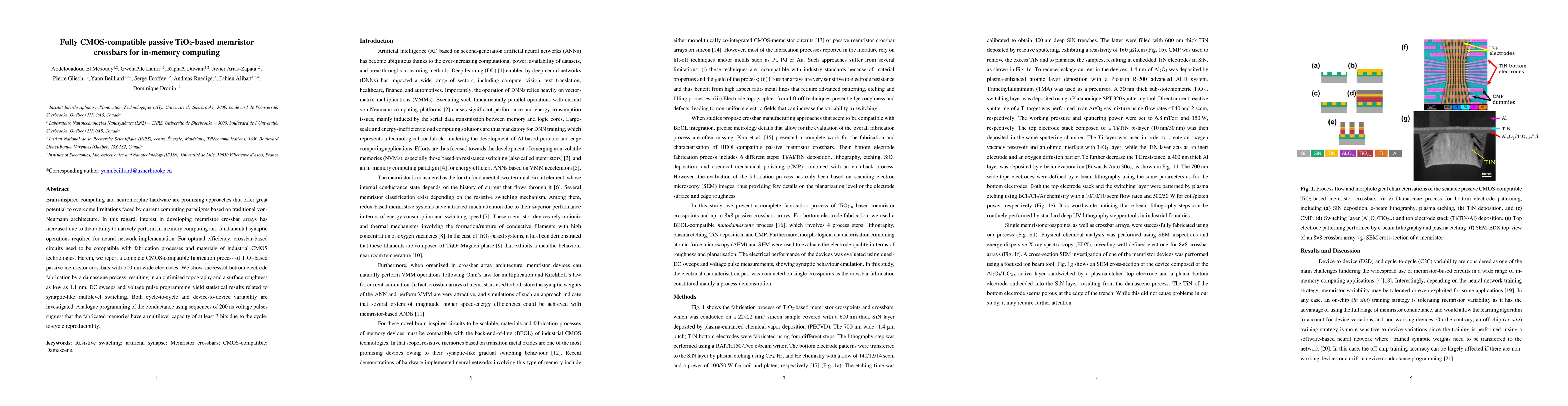 Brain-inspired computing and neuromorphic hardware are promising approaches that offer great potential to overcome limitations faced by current computing paradigms based on traditional von-Neumann architecture. In this regard, interest in developing memristor crossbar arrays has increased due to their ability to natively perform in-memory computing and fundamental synaptic operations required for neural network implementation. For optimal efficiency, crossbar-based circuits need to be compatible with fabrication processes and materials of industrial CMOS technologies. Herein, we report a complete CMOS-compatible fabrication process of TiO2-based passive memristor crossbars with 700 nm wide electrodes. We show successful bottom electrode fabrication by a damascene process, resulting in an optimised topography and a surface roughness as low as 1.1 nm. DC sweeps and voltage pulse programming yield statistical results related to synaptic-like multilevel switching. Both cycle-to-cycle and device-to-device variability are investigated. Analogue programming of the conductance using sequences of 200 ns voltage pulses suggest that the fabricated memories have a multilevel capacity of at least 3 bits due to the cycle-to-cycle reproducibility.