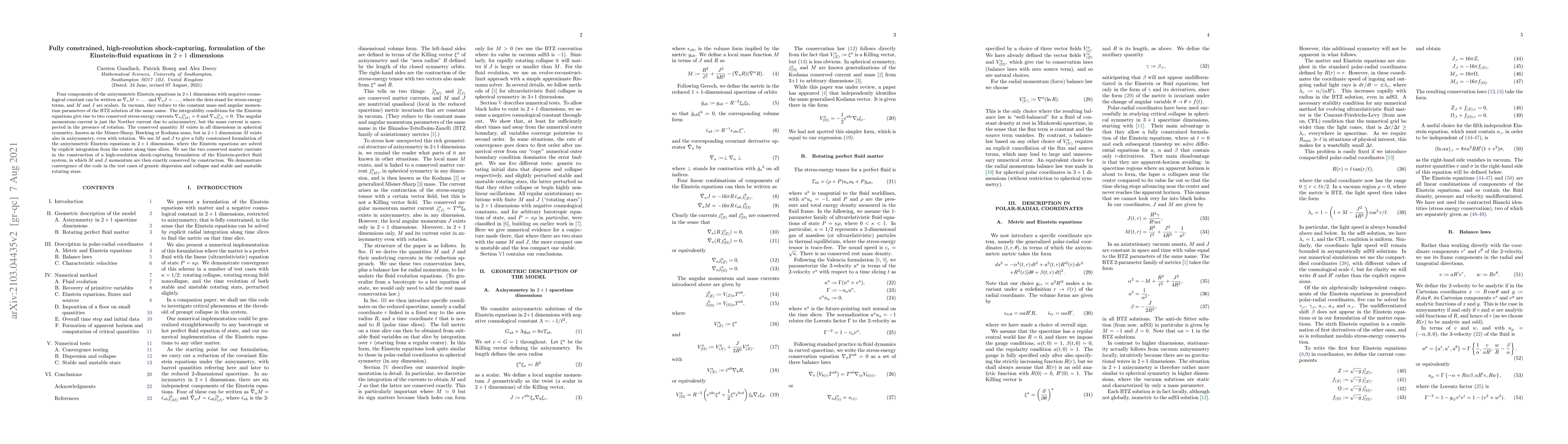 Four components of the axisymmetric Einstein equations in 2+1 dimensions with negative cosmological constant can be written as $\nabla_aM=\dots$ and $\nabla_aJ=\dots$, where the dots stand for stress-energy terms, and $M$ and $J$ are scalars. In vacuum, they reduce to the constant mass and angular momentum parameters of the BTZ solution of the same name. The integrability conditions for the Einstein equations give rise to two conserved stress-energy currents $\nabla_aj^a_{(M)}=0$ and $\nabla_aj^a_{(J)}=0$. The angular momentum current is just the Noether current due to axisymmetry, but the mass current is unexpected in the presence of rotation. The conserved quantity $M$ exists in all dimensions in spherical symmetry, known as the Misner-Sharp, Hawking or Kodama mass, but in 2+1 dimensions $M$ exists also in axisymmetry, even with rotation. We use $M$ and $J$ to give a fully constrained formulation of the axisymmetric Einstein equations in 2+1 dimensions, where the Einstein equations are solved by explicit integration from the center along time slices. We use the two conserved matter currents in the construction of a high-resolution shock-capturing formulation of the Einstein-perfect fluid system, in which $M$ and $J$ momentum are then exactly conserved by construction. We demonstrate convergence of the code in the test cases of generic dispersion and collapse and stable and unstable rotating stars.