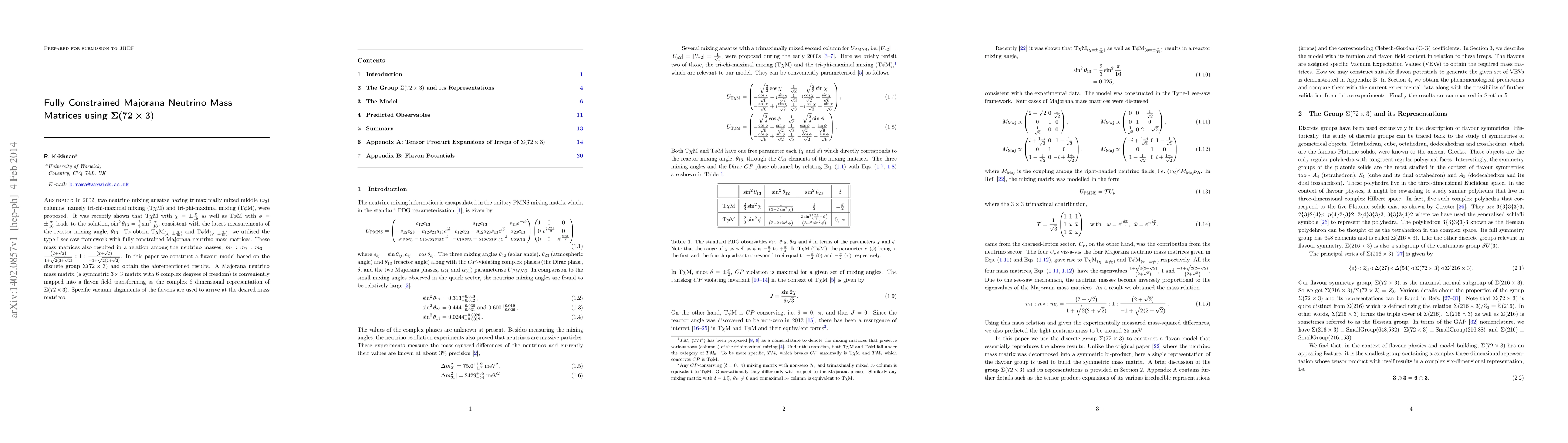 In 2002, two neutrino mixing ansatze having trimaximally mixed middle ($\nu_2$) columns, namely tri-chi-maximal mixing ($\text{T}\chi\text{M}$) and tri-phi-maximal mixing ($\text{T}\phi\text{M}$), were proposed. It was recently shown that $\text{T}\chi\text{M}$ with $\chi=\pm \frac{\pi}{16}$ as well as $\text{T}\phi\text{M}$ with $\phi = \pm \frac{\pi}{16}$ leads to the solution, $\sin^2 \theta_{13} = \frac{2}{3} \sin^2 \frac{\pi}{16}$, consistent with the latest measurements of the reactor mixing angle, $\theta_{13}$. To obtain $\text{T}\chi\text{M}_{(\chi=\pm \frac{\pi}{16})}$ and $\text{T}\phi\text{M}_{(\phi=\pm \frac{\pi}{16})}$, we utilised the type I see-saw framework with fully constrained Majorana neutrino mass matrices. These mass matrices also resulted in a relation among the neutrino masses, $m_1:m_2:m_3=\frac{\left(2+\sqrt{2}\right)}{1+\sqrt{2(2+\sqrt{2})}}:1:\frac{\left(2+\sqrt{2}\right)}{-1+\sqrt{2(2+\sqrt{2})}}$. In this paper we construct a flavour model based on the discrete group $\Sigma(72\times3)$ and obtain the aforementioned results. A Majorana neutrino mass matrix (a symmetric $3\times3$ matrix with 6 complex degrees of freedom) is conveniently mapped into a flavon field transforming as the complex 6 dimensional representation of $\Sigma(72\times3)$. Specific vacuum alignments of the flavons are used to arrive at the desired mass matrices.