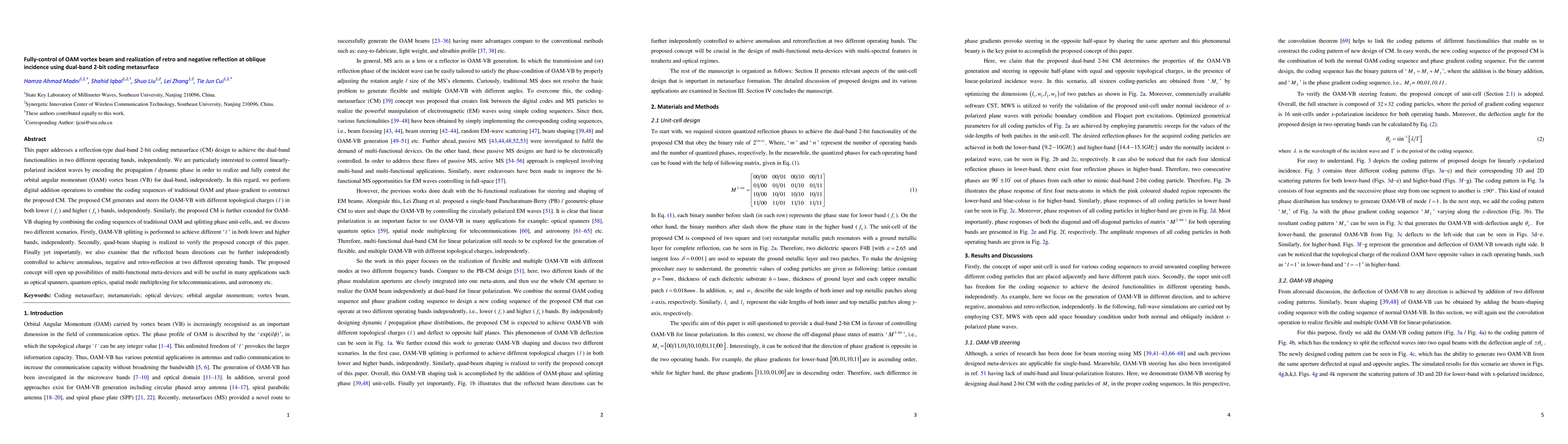 This paper designs a dual-band 2-bit coding metasurface to independently control orbital angular momentum vortex beams in two operating bands, enabling retro and negative reflection at oblique incidence. The metasurface combines traditional OAM and phase-gradient coding sequences for versatile beam shaping and reflection control.