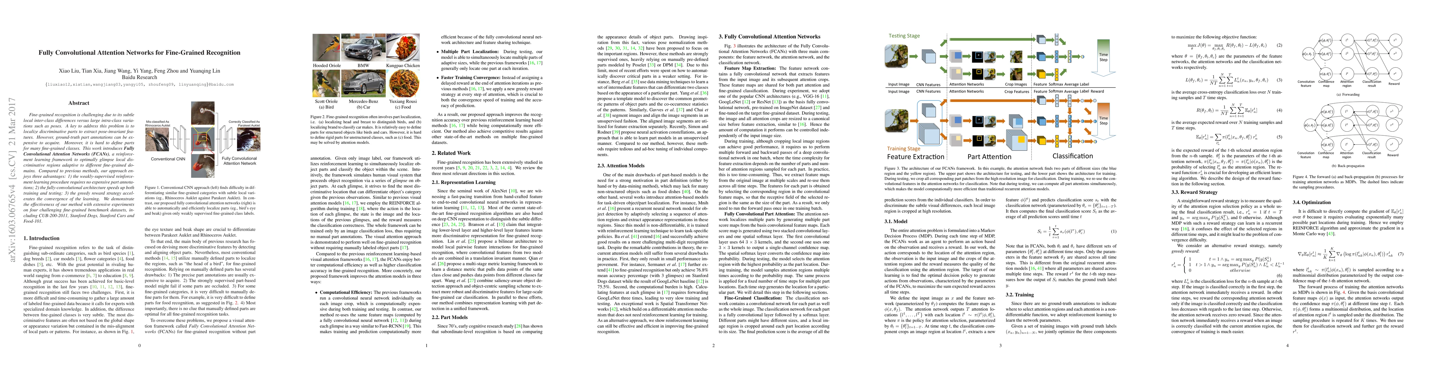 This paper proposes Fully Convolutional Attention Networks (FCANs) for fine-grained recognition, leveraging reinforcement learning to adaptively identify discriminative regions without requiring expensive part annotations. The method benefits from a fully-convolutional architecture and a greedy reward strategy, demonstrating effectiveness across multiple fine-grained datasets.