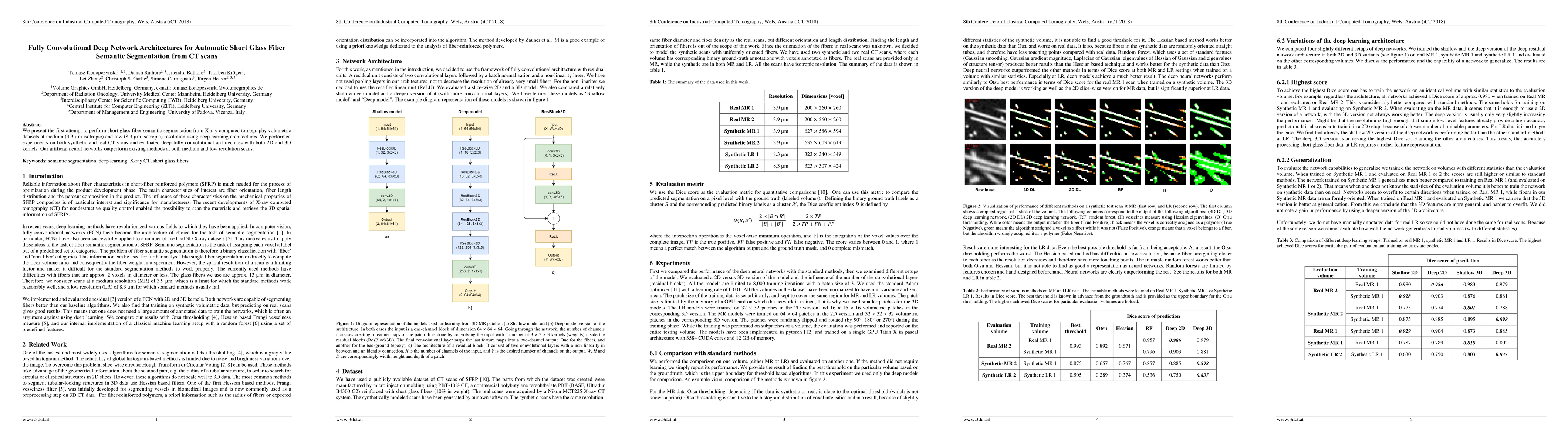 We present the first attempt to perform short glass fiber semantic segmentation from X-ray computed tomography volumetric datasets at medium (3.9 {\mu}m isotropic) and low (8.3 {\mu}m isotropic) resolution using deep learning architectures. We performed experiments on both synthetic and real CT scans and evaluated deep fully convolutional architectures with both 2D and 3D kernels. Our artificial neural networks outperform existing methods at both medium and low resolution scans.