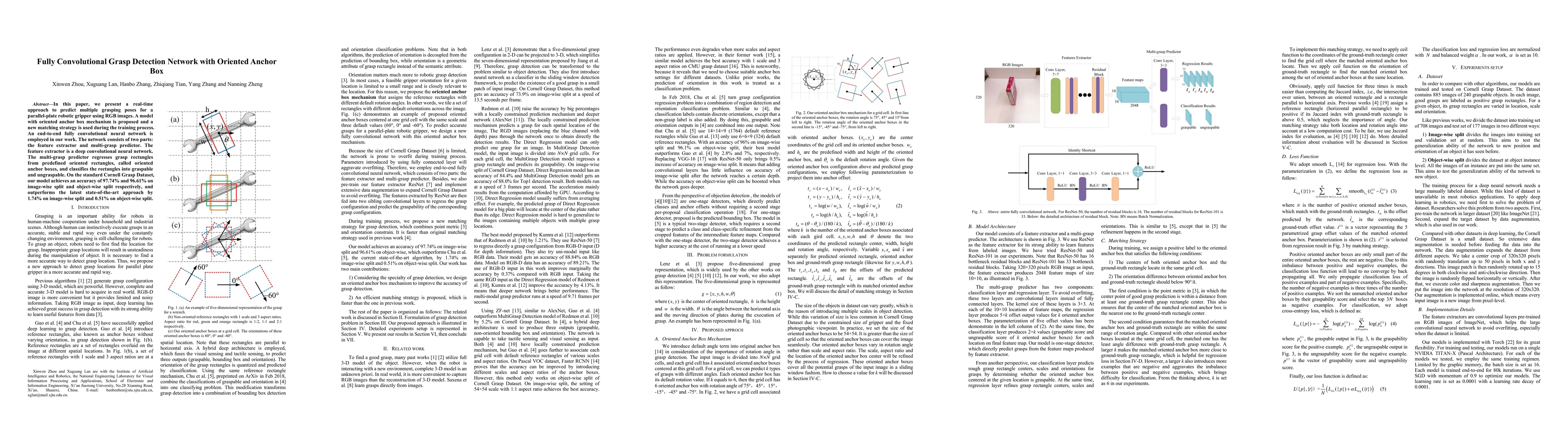 This paper introduces a real-time fully convolutional network for predicting multiple grasping poses using RGB images, employing an oriented anchor box mechanism and a new matching strategy. The model outperforms existing methods, achieving 97.74% accuracy on image-wise and 96.61% on object-wise splits of the Cornell Grasp Dataset.