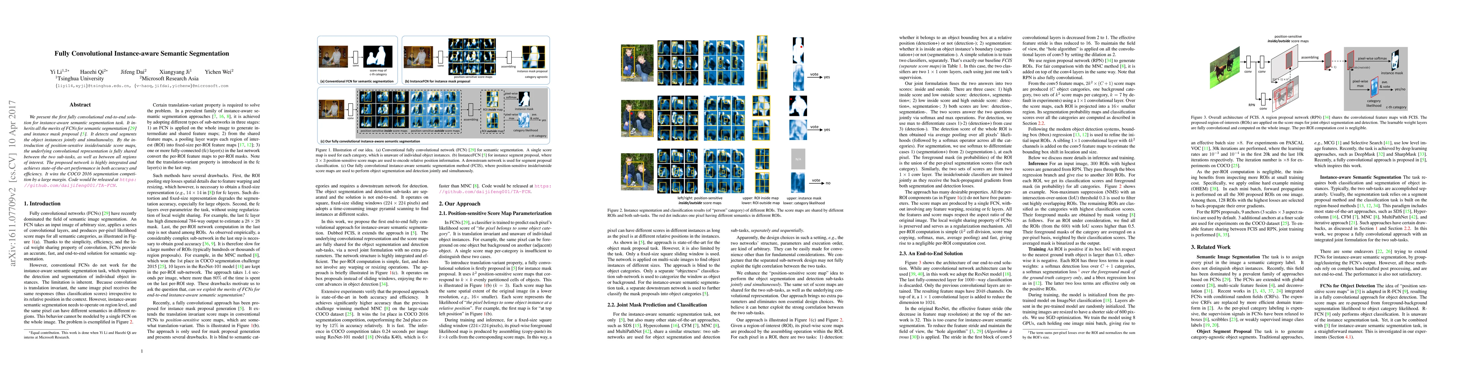 This paper introduces a fully convolutional network for instance-aware semantic segmentation, achieving state-of-the-art results by jointly predicting instance masks and classifications. The network shares convolutional representations across tasks and regions, winning the COCO 2016 segmentation competition.