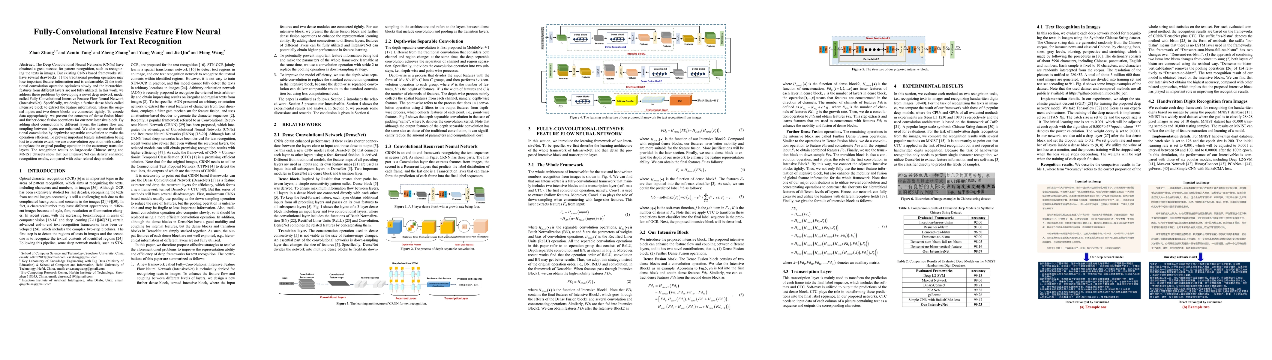 The Deep Convolutional Neural Networks (CNNs) have obtained a great success for pattern recognition, such as recognizing the texts in images. But existing CNNs based frameworks still have several drawbacks: 1) the traditaional pooling operation may lose important feature information and is unlearnable; 2) the tradi-tional convolution operation optimizes slowly and the hierar-chical features from different layers are not fully utilized. In this work, we address these problems by developing a novel deep network model called Fully-Convolutional Intensive Feature Flow Neural Network (IntensiveNet). Specifically, we design a further dense block called intensive block to extract the feature information, where the original inputs and two dense blocks are connected tightly. To encode data appropriately, we present the concepts of dense fusion block and further dense fusion opera-tions for our new intensive block. By adding short connections to different layers, the feature flow and coupling between layers are enhanced. We also replace the traditional convolution by depthwise separable convolution to make the operation efficient. To prevent important feature information being lost to a certain extent, we use a convolution operation with stride 2 to replace the original pooling operation in the customary transition layers. The recognition results on large-scale Chinese string and MNIST datasets show that our IntensiveNet can deliver enhanced recog-nition results, compared with other related deep models.