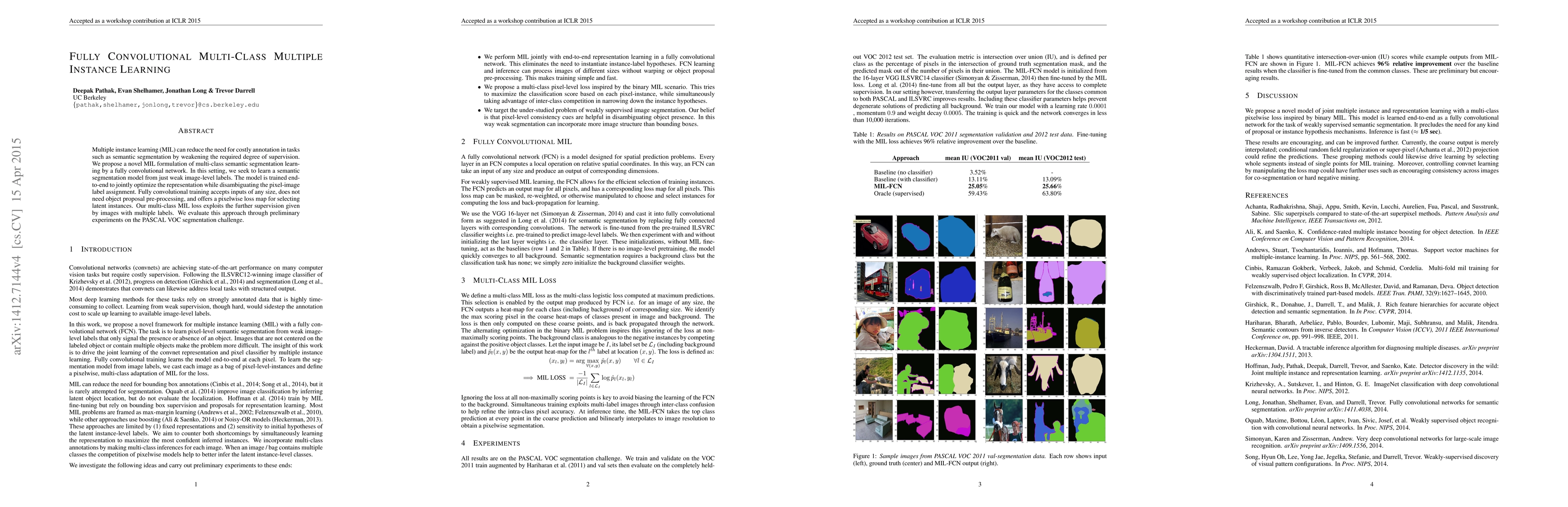 This paper proposes a fully convolutional network for multi-class semantic segmentation using multiple instance learning (MIL) with weak image-level labels, eliminating the need for detailed annotations. The model is trained end-to-end to optimize representation and disambiguate pixel-image label assignments, evaluated on the PASCAL VOC segmentation challenge.